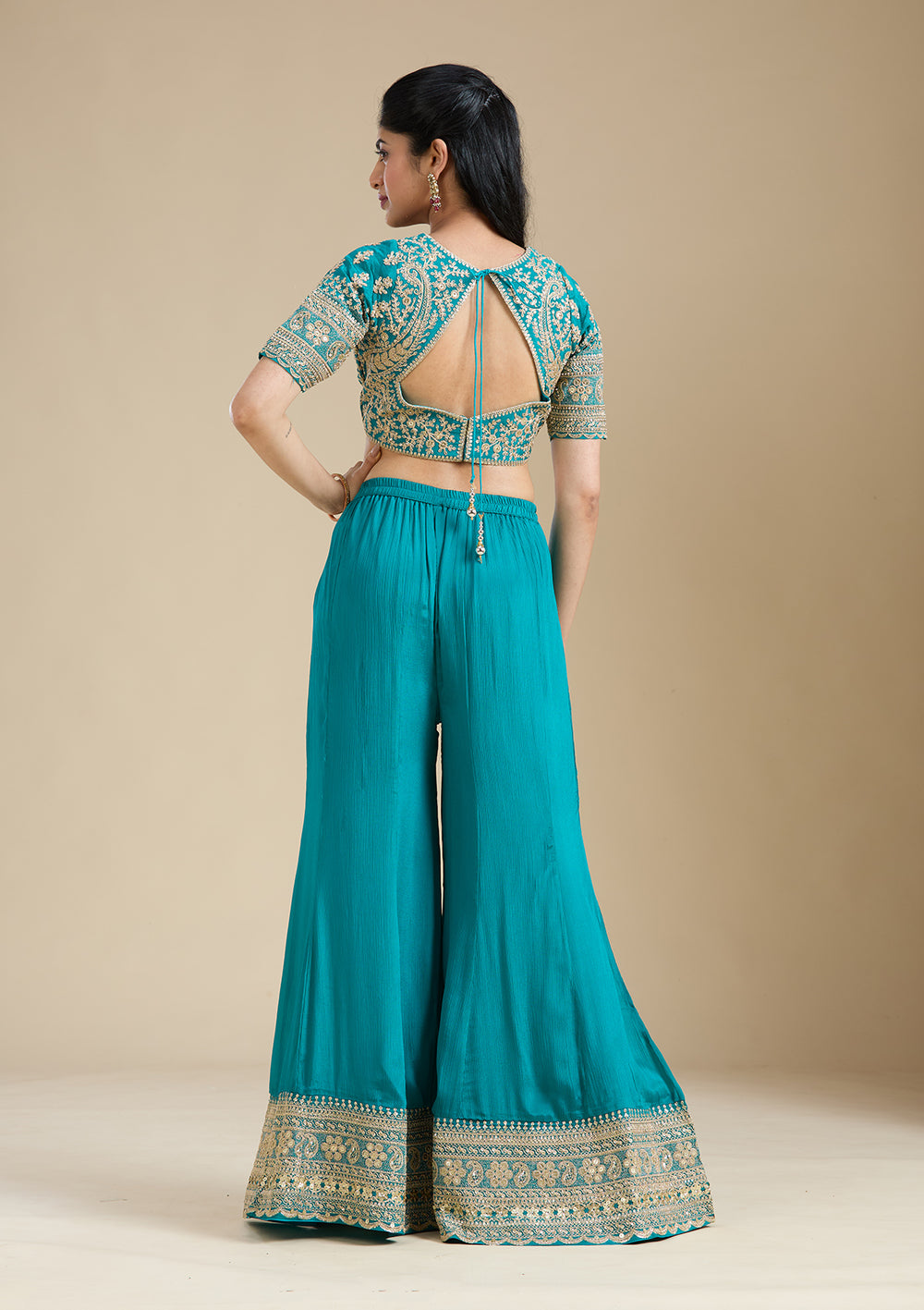 - Cropped Palazzo Suits: Cropped palazzos are not floor-sweeping ones, rather they are shorter than ankle-length. You can pair them with frock-style kurtas for a modern ethnic vibe. Besides, you can accessorise them with fashionable footwear as it exposes your feet area.