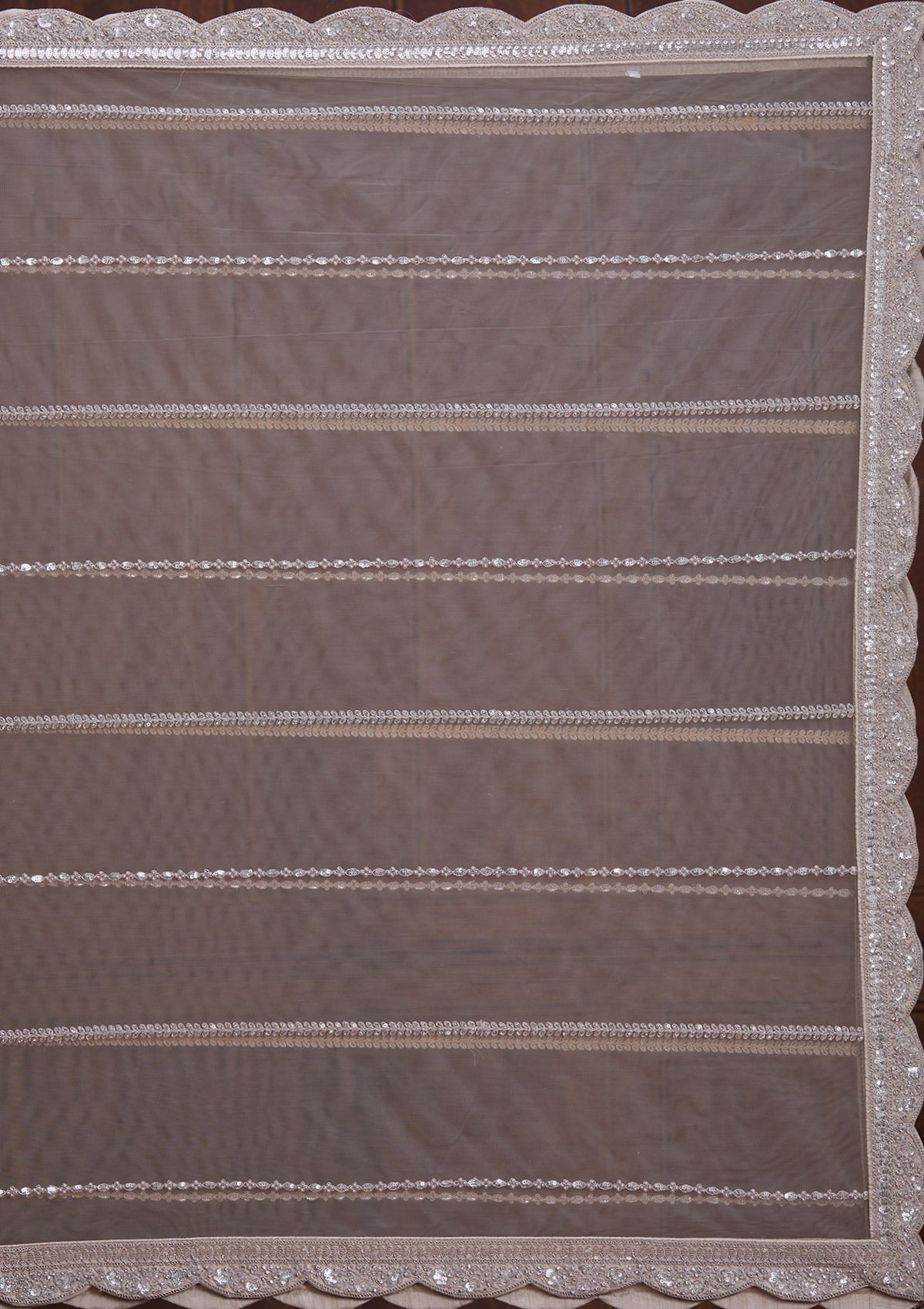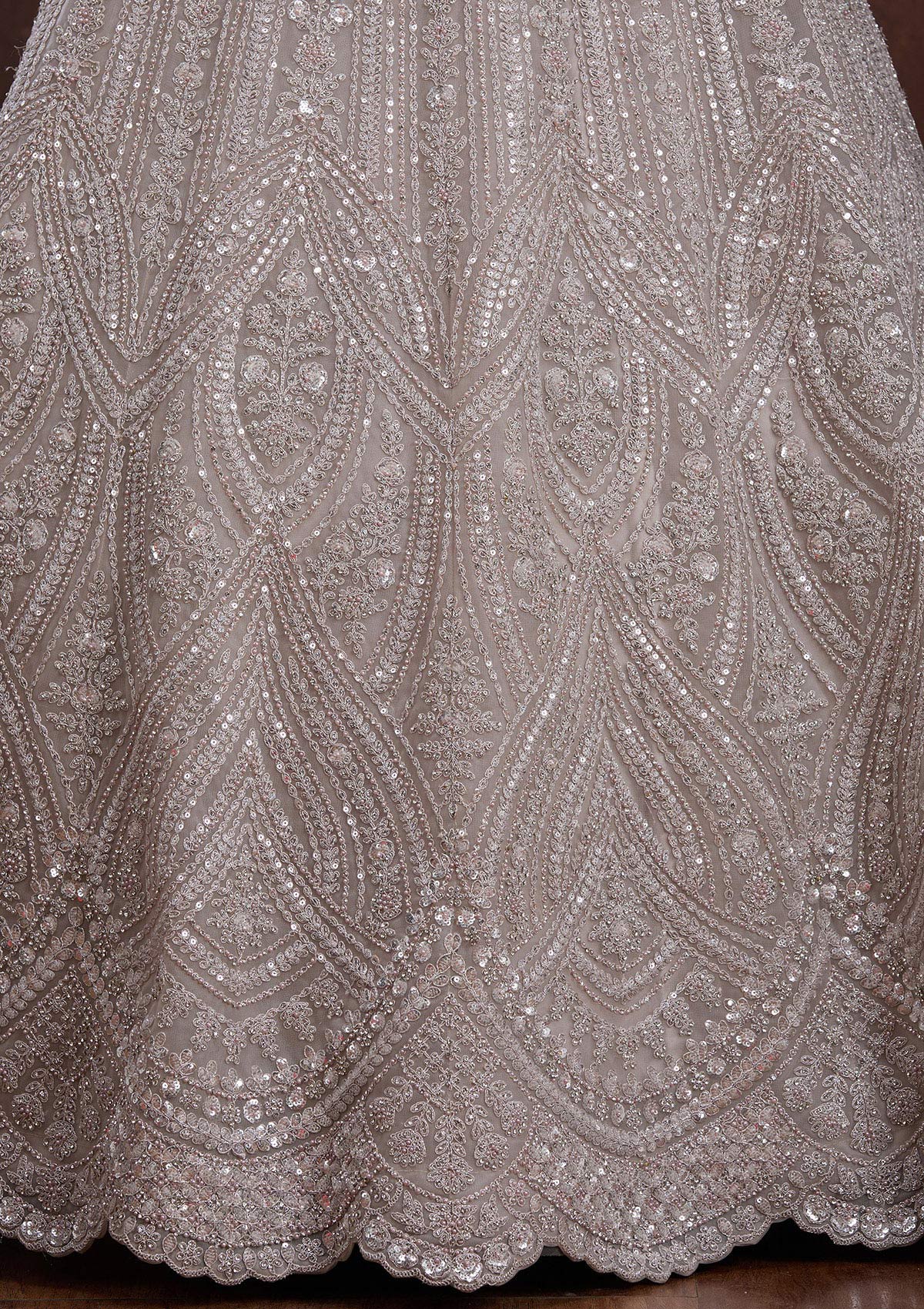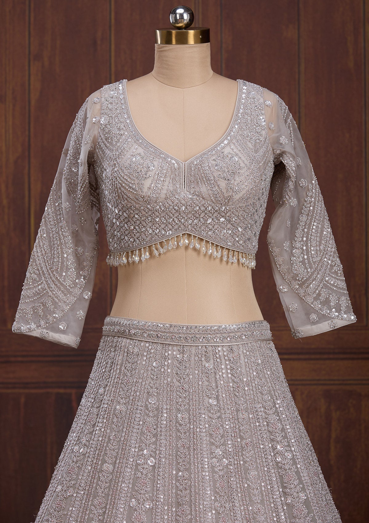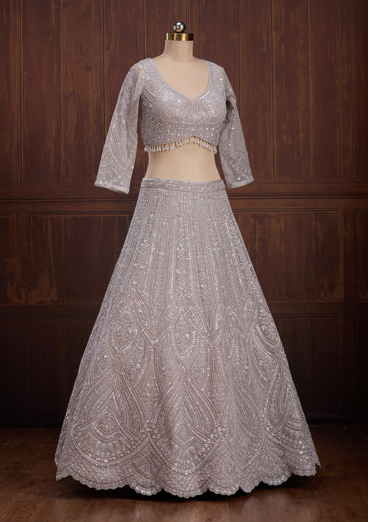 Step into the spotlight with Koskii's silver net lehenga, where tradition meets tantalizing charm! This enchanting ensemble is adorned with intricate silver zariwork, casting a spell of shimmering sophistication. The sheer net fabric pirouettes gracefully with every twirl, ensuring you feel as fabulous as you look. Embrace your playful spirit and bring a sparkle to the evening in this vibrantly designed masterpiece.