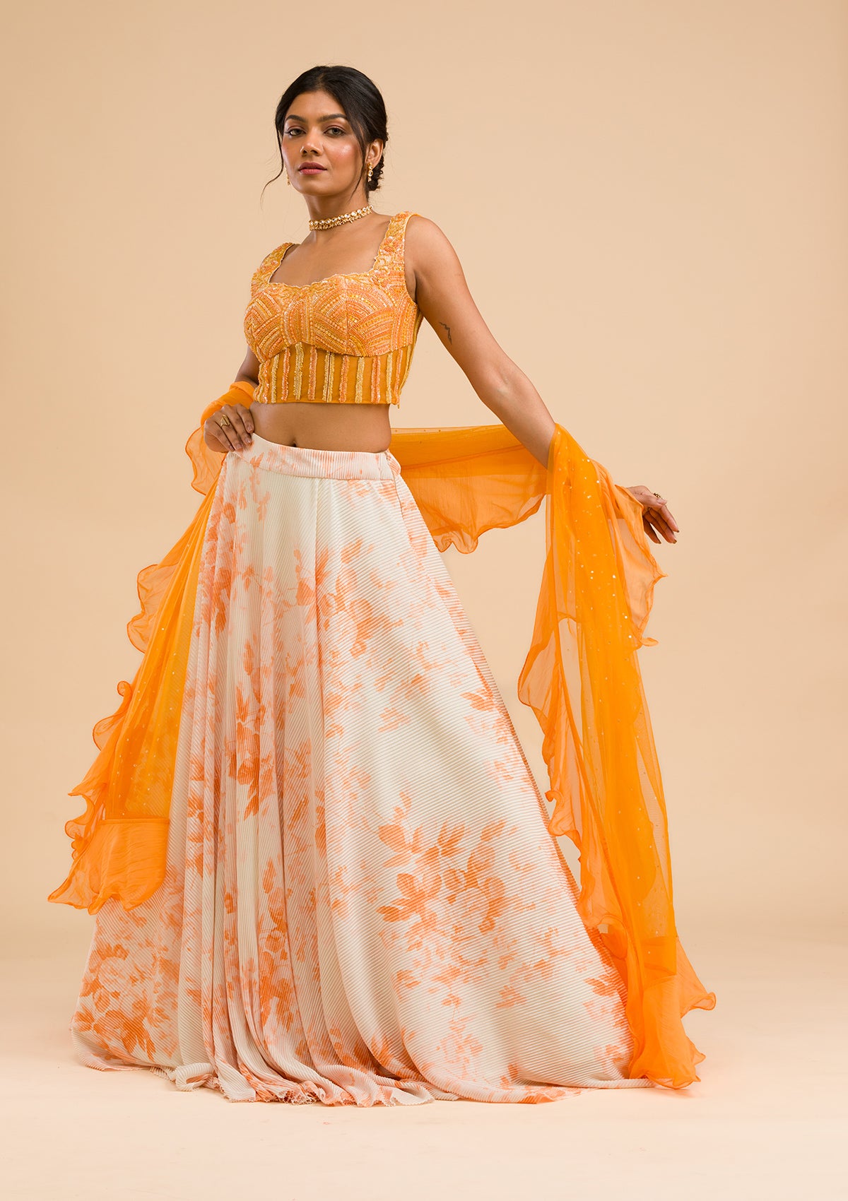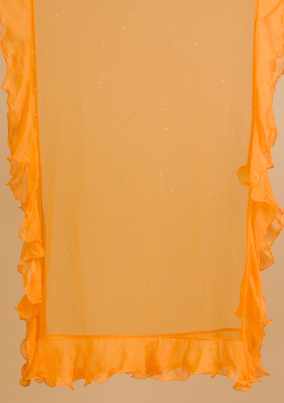 Twirl with delight in Koskii's latest ensemble, where each swirl of the orange lehenga reveals the lustrous sheen of imported fabric delightfully adorned with gleaming cutdana embroidery. Designed to dazzle at any gathering, this vibrant creation blends traditional allure with a punch of modern elegance, making you the effervescent star of every event. Step into a world of color and charm, and let your spirit dance in Koskii’s mesmerizing outfit!.