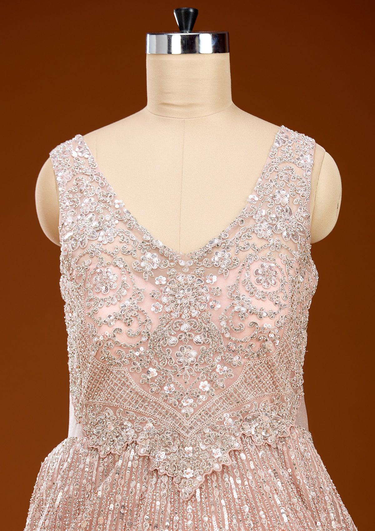 Peach Readymade Gown in Net fabric. The Gown is embellished with Stonework embroidery. The Peach Gown has a V Neck. Comes with the Koskii promise of premium quality.