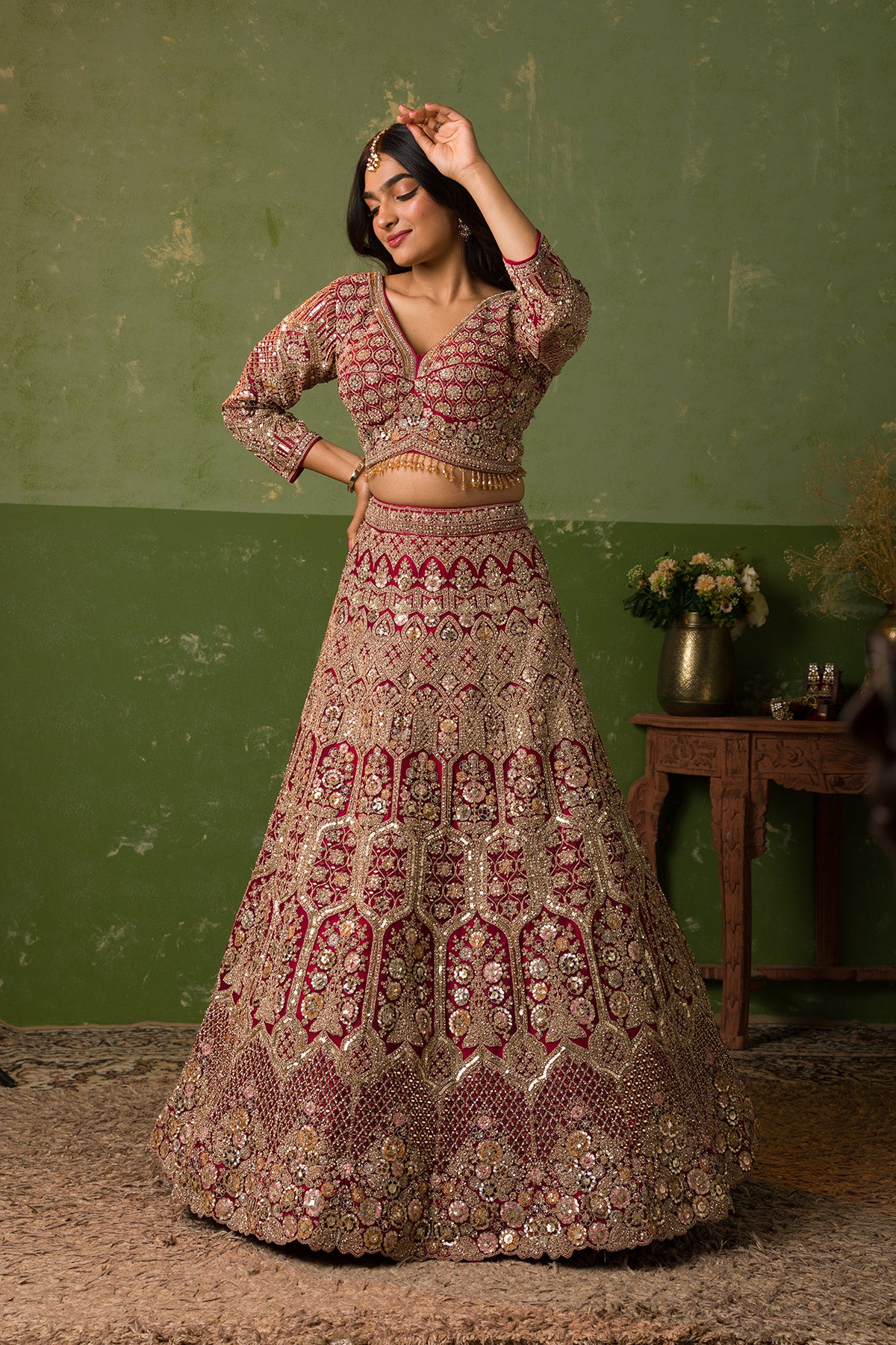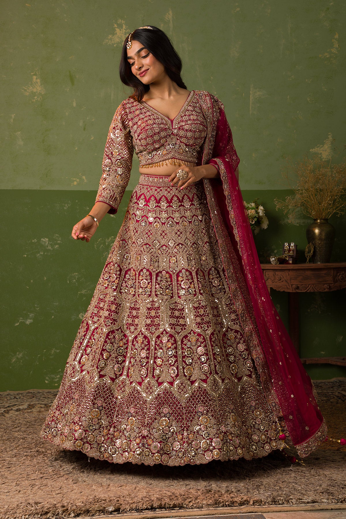 Twirl into your big day with Koskii’s breathtaking maroon Lehenga, where every detail is a whisper of dreamy romance. Crafted in luxurious net fabric, this piece is adorned with intricate cording embroidery that dazzles with every step. The vibrant maroon palette ignites a celebration of color and style, making this Lehenga a masterpiece of craftsmanship perfect for the modern bride who loves to express her vibrant spirit elegantly.