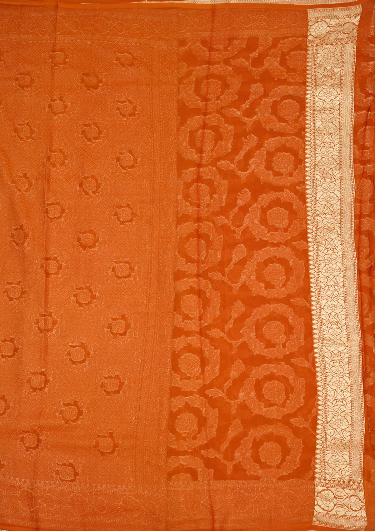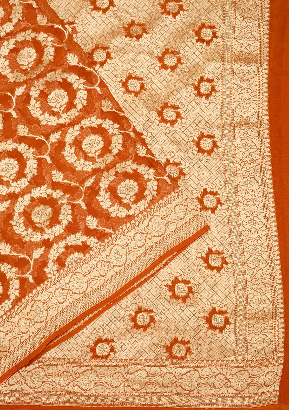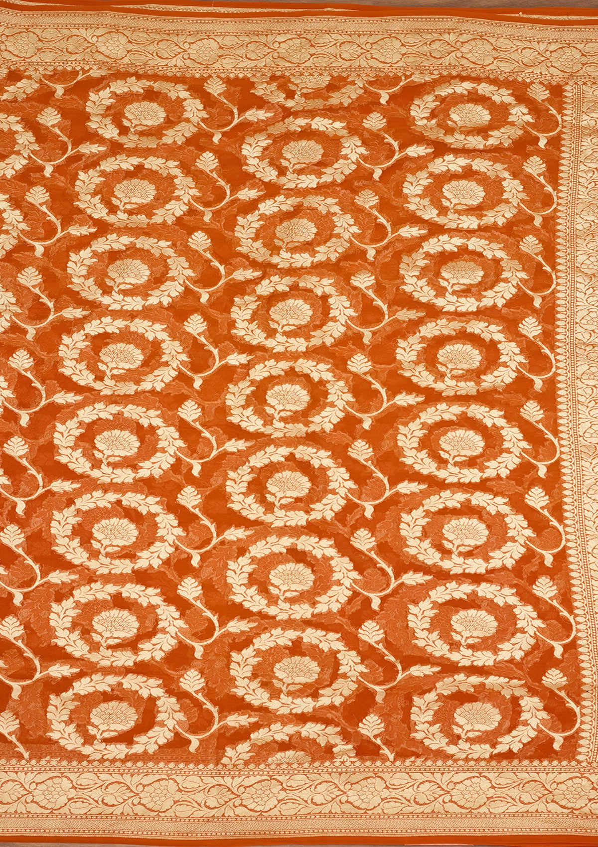 Rust Silk_Saree in Georgette fabric. The Silk_Saree is elevated with Zariwork embroidery. It comes with an Unstitched blouse. Comes with the Koskii promise of premium quality.