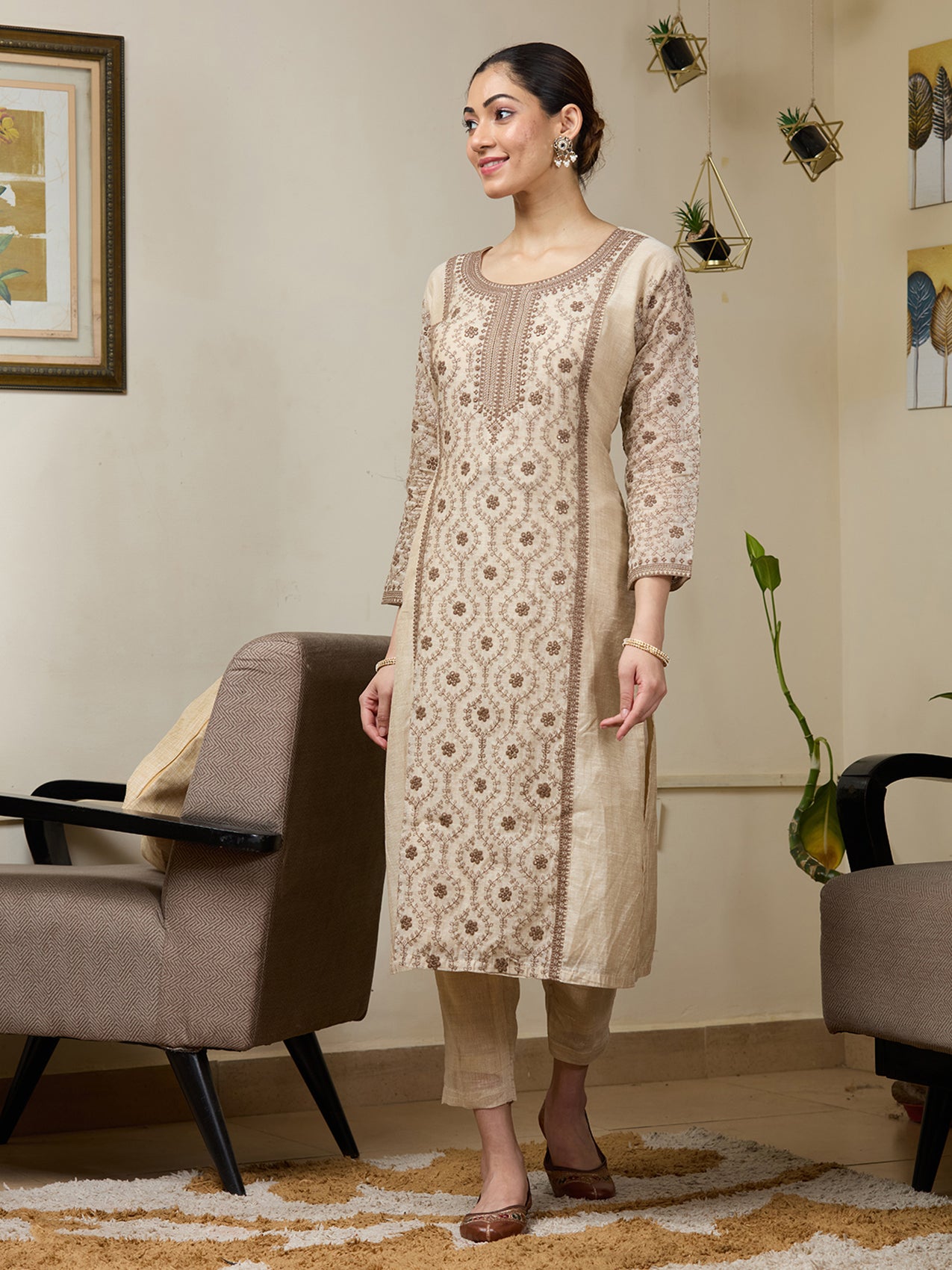 Beige Threadwork Chanderi Readymade Salwar Suit