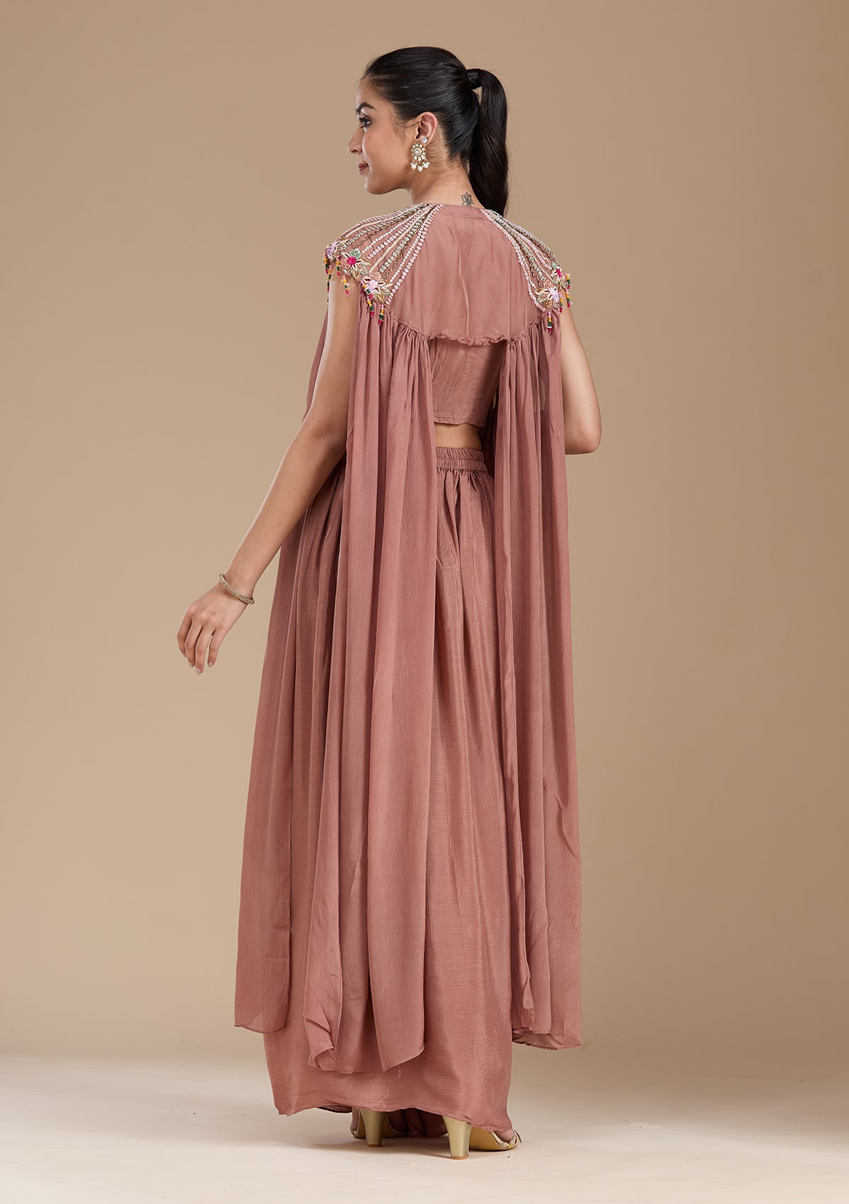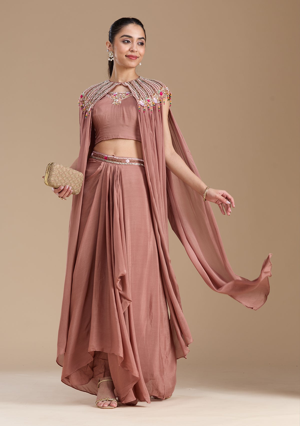 Brown Salwar Suit in Georgette fabric. The Salwar Suit is embellished with Cutdana embroidery. Accompanied with a bottom and dupatta. Comes with the Koskii promise of premium quality.