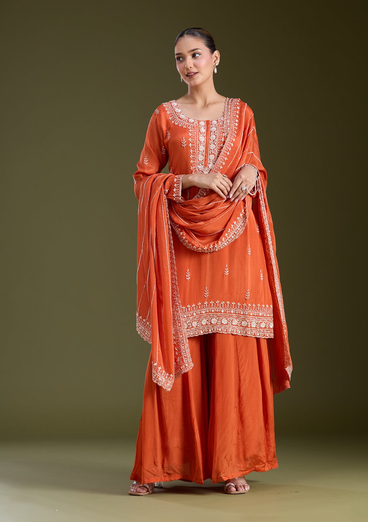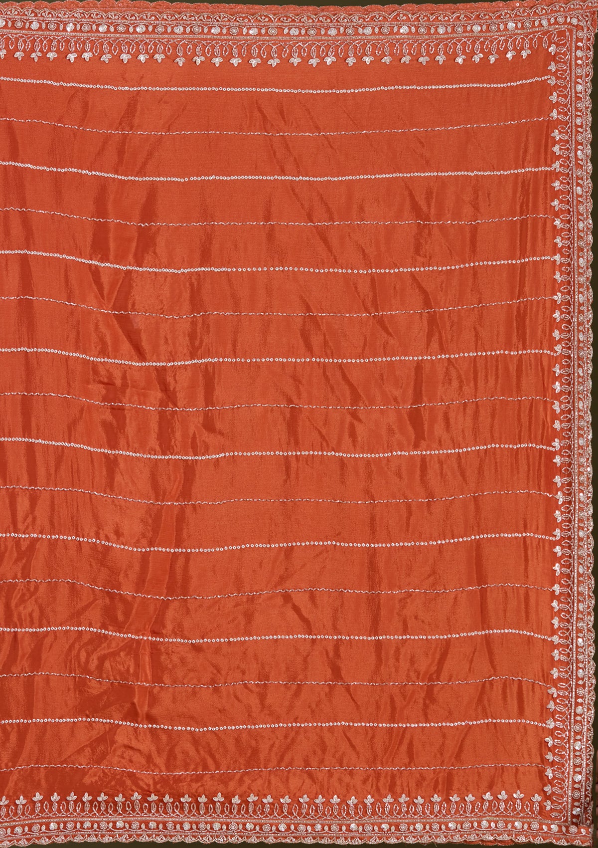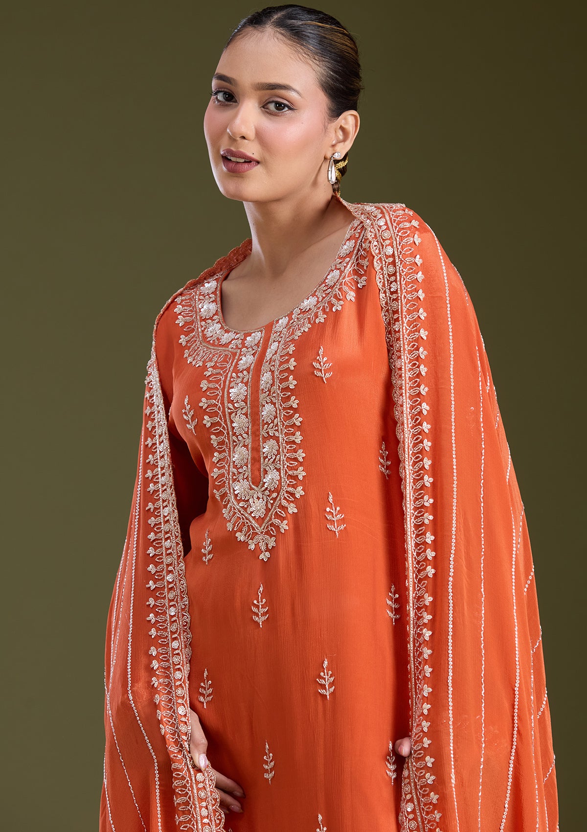 Orange Salwar_RM in Soft Raw Silk fabric. The Salwar_RM is embellished with Sequins embroidery. Accompanied with a bottom and dupatta. Comes with the Koskii promise of premium quality.