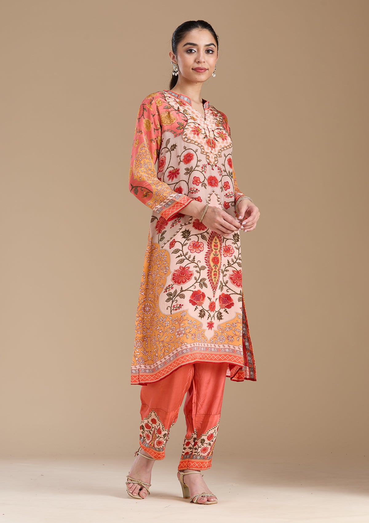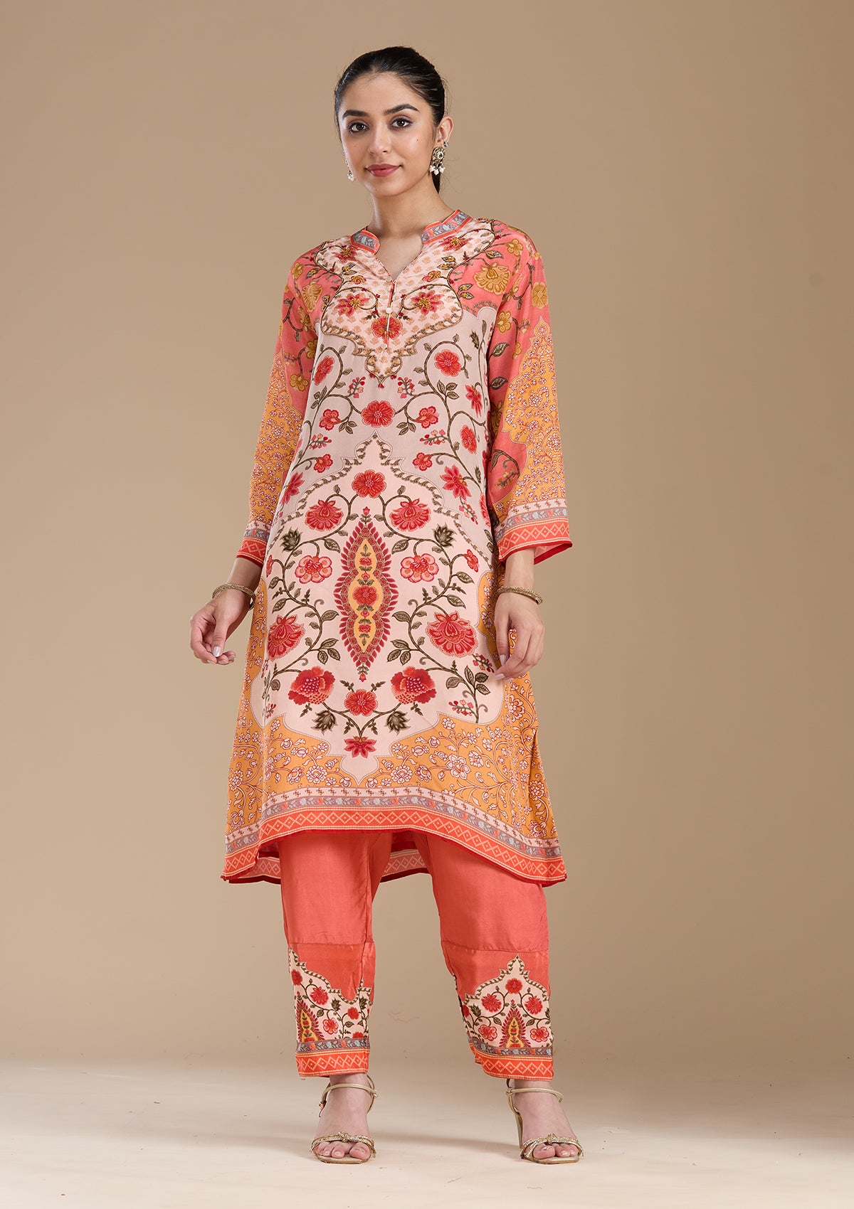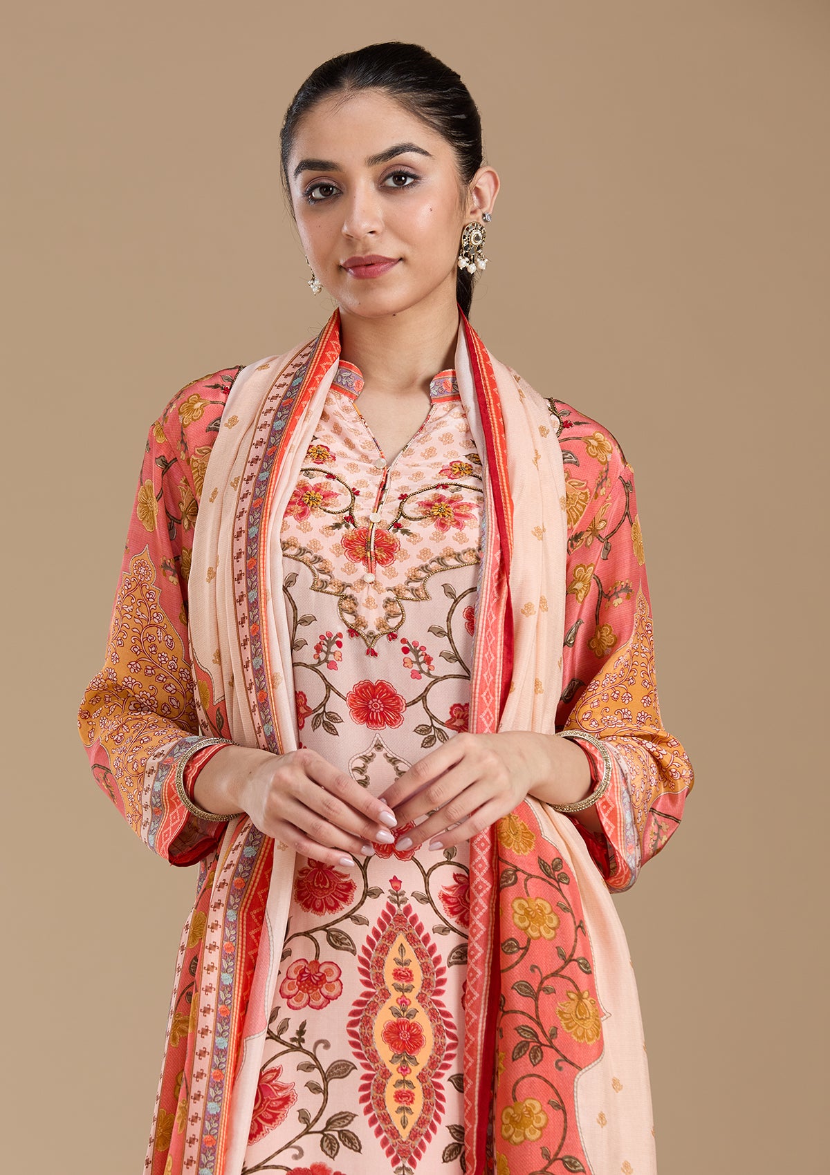Peach Salwar Suit in Crepe fabric. The Salwar Suit is embellished with embroidery. Accompanied with a bottom and dupatta. Comes with the Koskii promise of premium quality.