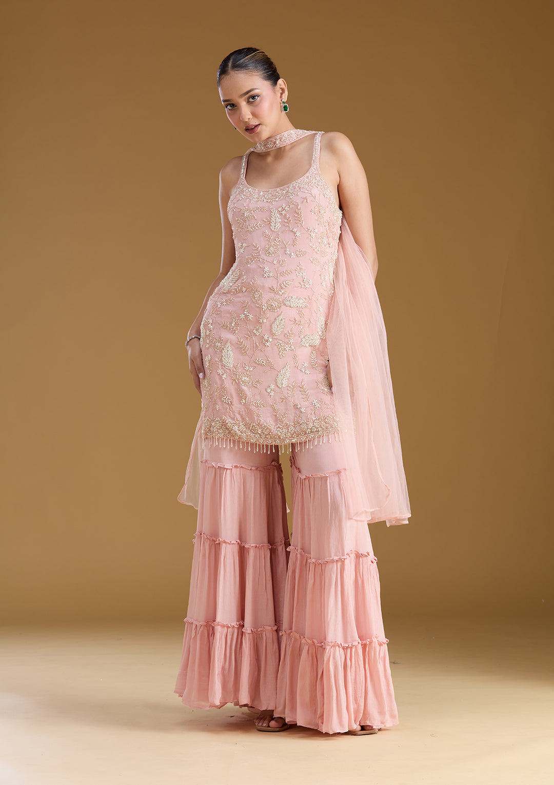 - Sharara Suit: This is a flattering silhouette for any body shape. A sharara is a pant that is fitted to the knees then flares out into a skirt almost. It is worn with a short, fitted kurta and a dupatta. It can be styled casually or dressed up for special occasions.