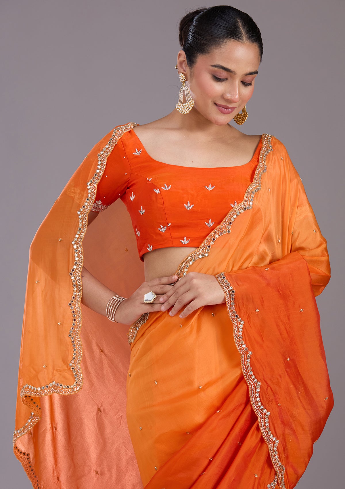 Orange Saree in Satin fabric. The Saree is elevated with Cutdana embroidery. It comes with an Unstitched blouse. Comes with the Koskii promise of premium quality.