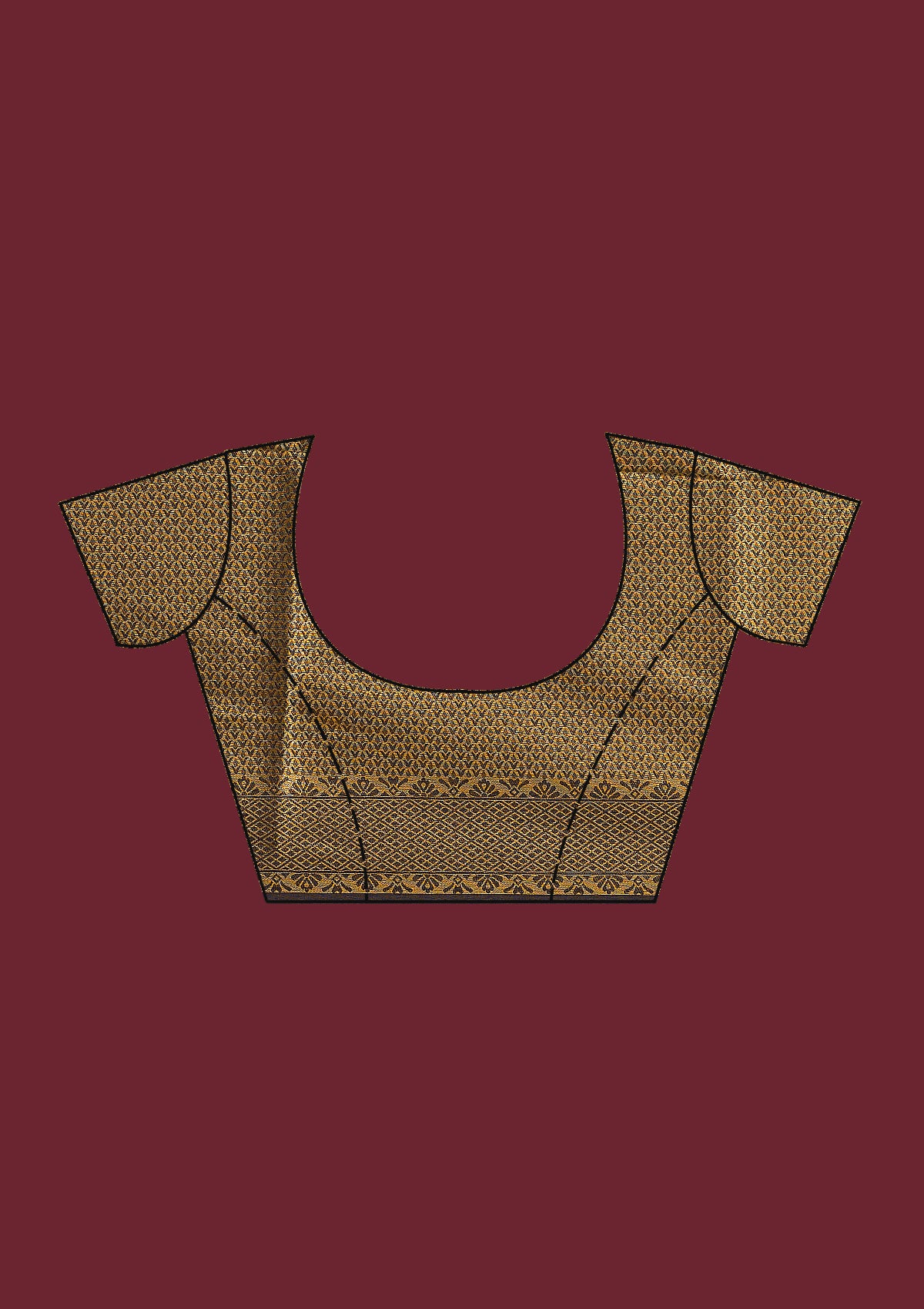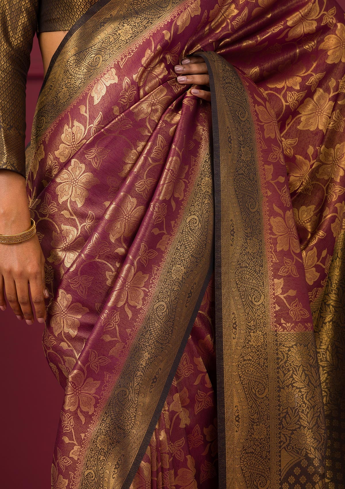 Maroon Saree in Soft Silk fabric. The Saree is elevated with Zariwork embroidery. It comes with an Unstitched blouse. Comes with the Koskii promise of premium quality.