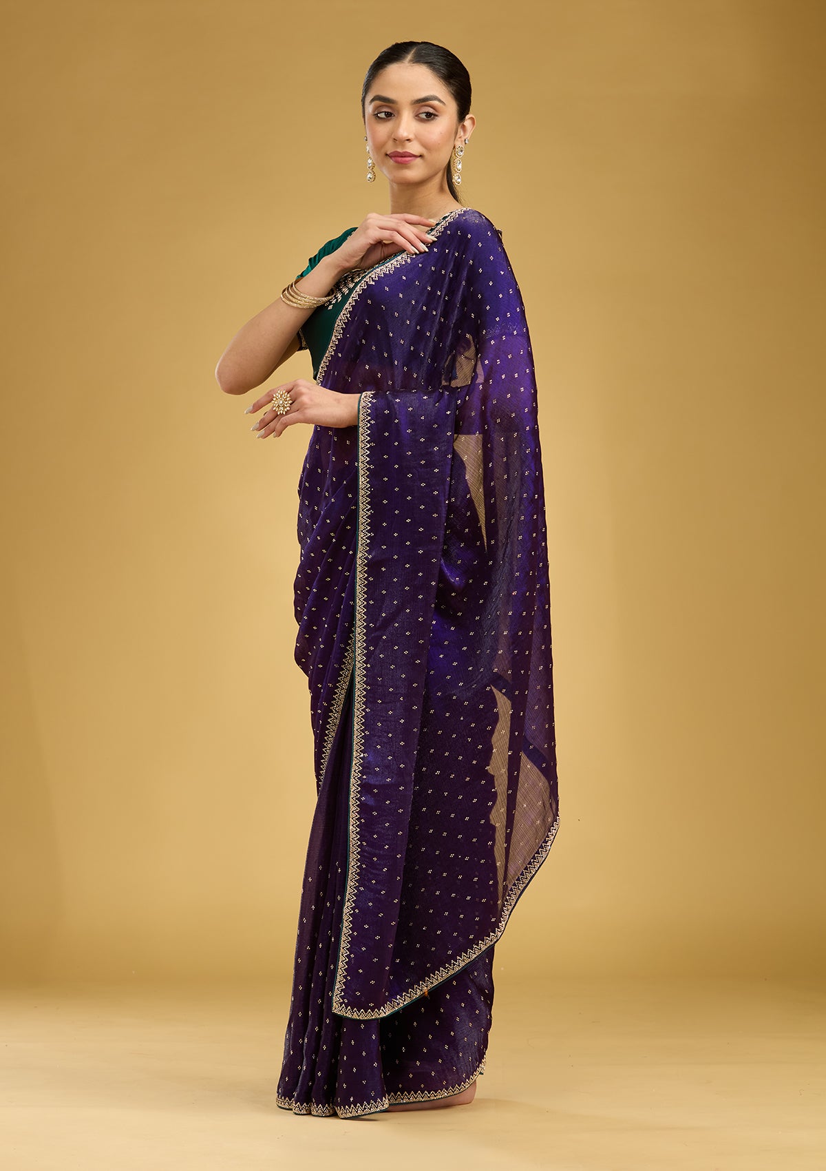 Purple Saree in Tissue fabric. The Saree is elevated with Stonework (Gold) embroidery. It comes with an Unstitched blouse. Comes with the Koskii promise of premium quality.