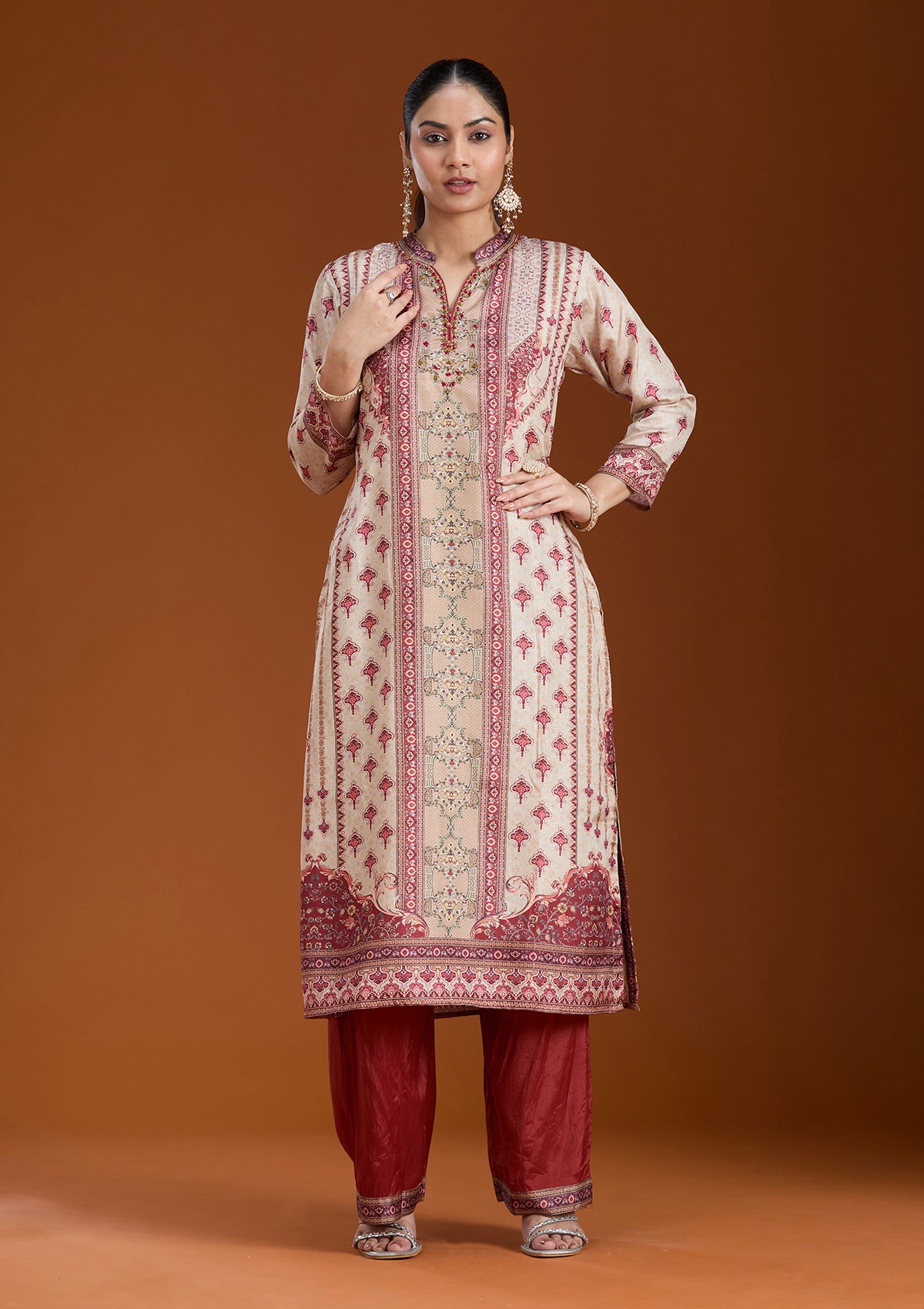 Beige Salwar Suit in Crepe fabric. The Salwar Suit is embellished with Printed embroidery. Accompanied with a bottom and dupatta. Comes with the Koskii promise of premium quality.