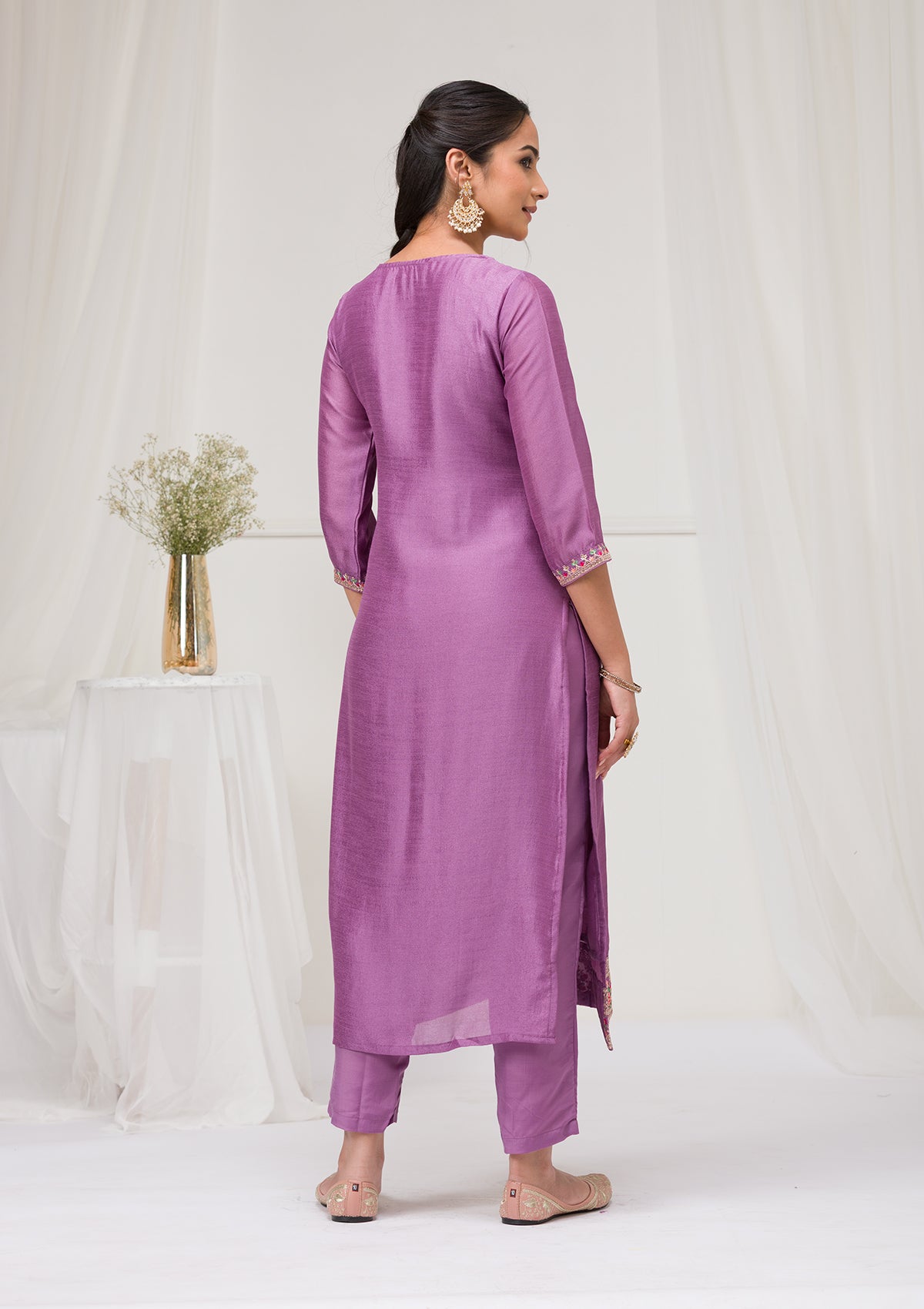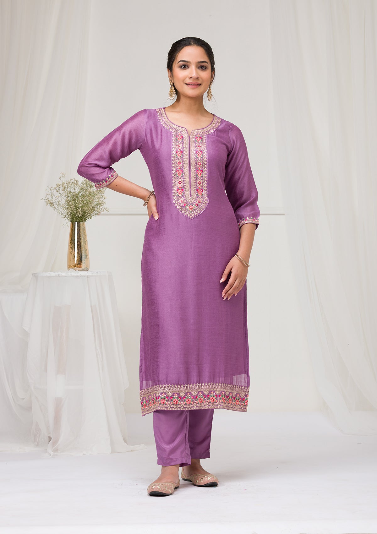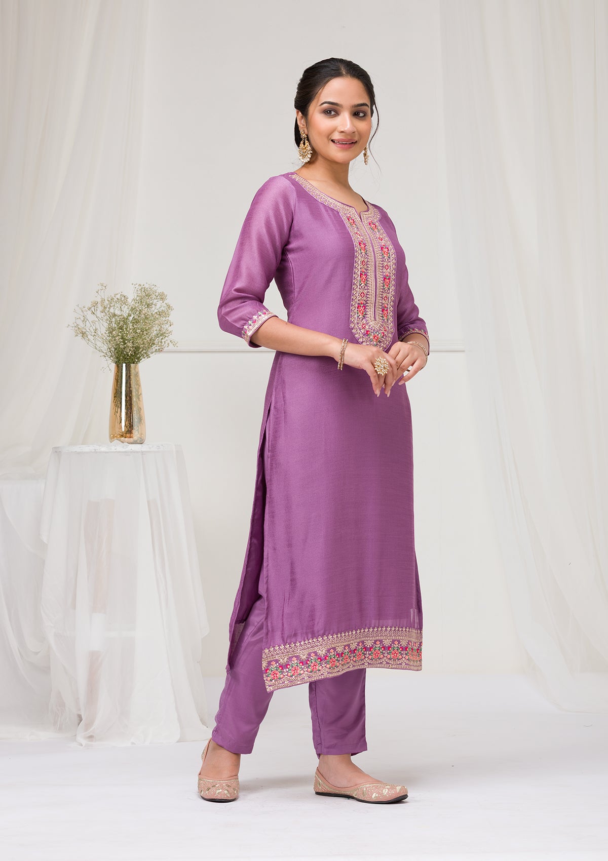 Lavender Threadwork Raw Silk Readymade Salwar Suit