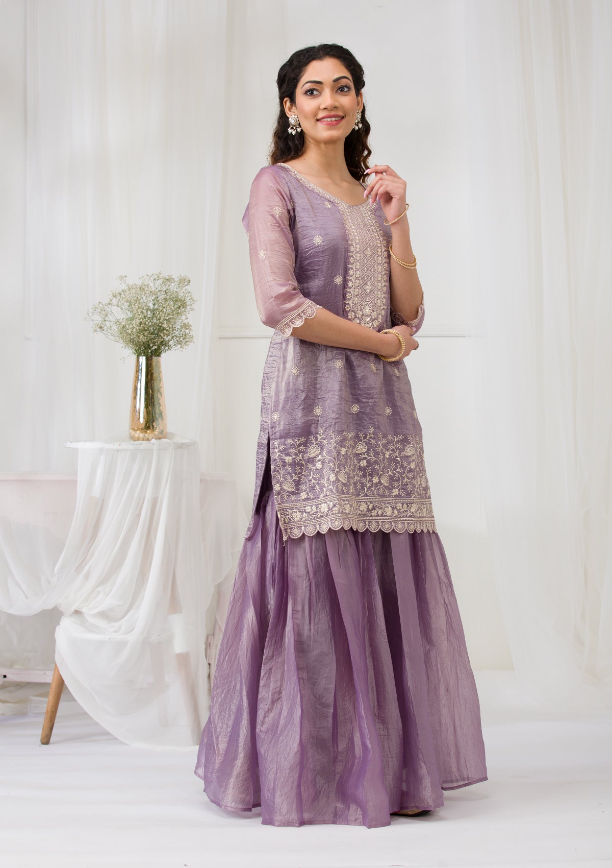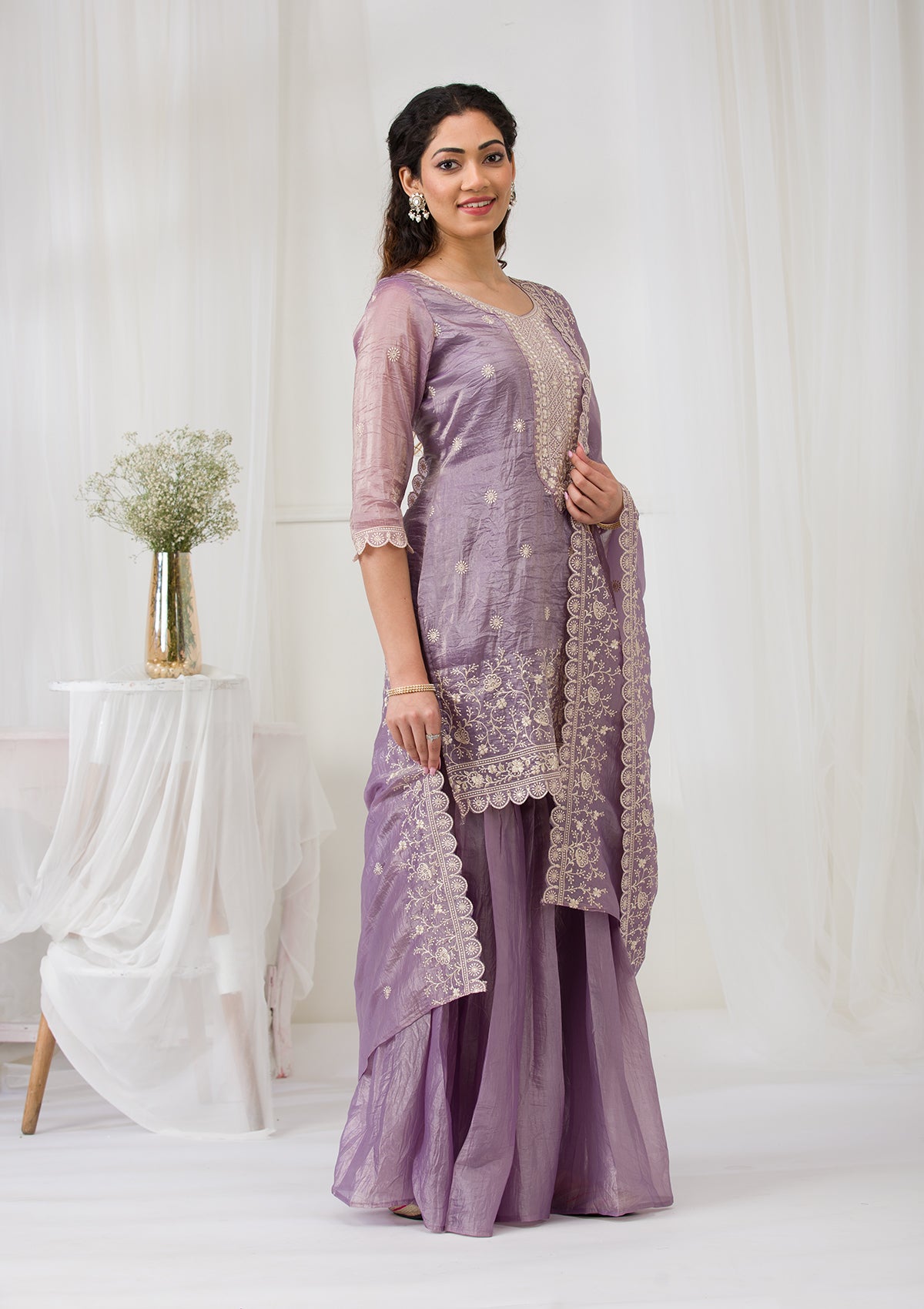 Lavender Threadwork Semi Crepe Readymade Sharara Suit