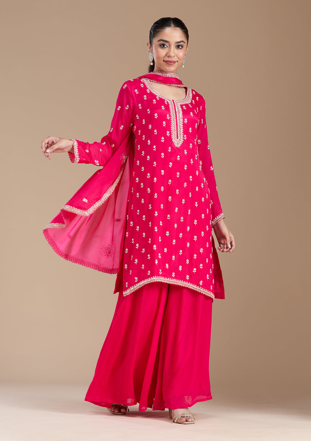 Straight cut suits from Koskii come in a variety of fabrics, each offering a unique look and feel. Semi-crepe is a lightweight, slightly textured fabric that drapes beautifully. Chanderi, with its luxurious sheen, offers an elegant look for festive occasions. Cotton straight cut suits are most popular as they are breathable and comfortable, making them ideal for everyday wear or casual outings, especially in warmer climates. Silk, on the other hand, is a rich, opulent fabric often chosen for weddings or formal events.