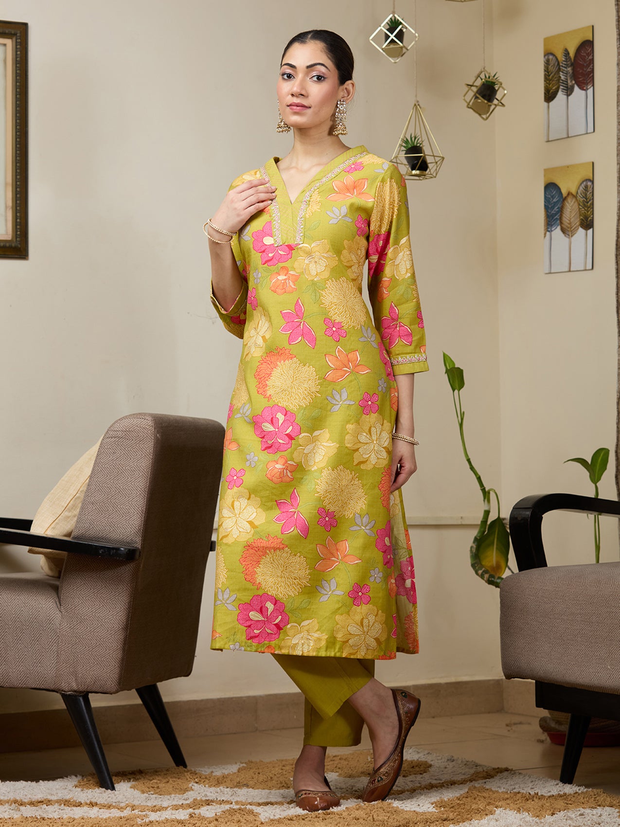 Pista Green Salwar Suit in Soft Raw Silk fabric. The Salwar Suit is embellished with Cording embroidery. Accompanied with a bottom and dupatta. Comes with the Koskii promise of premium quality.
