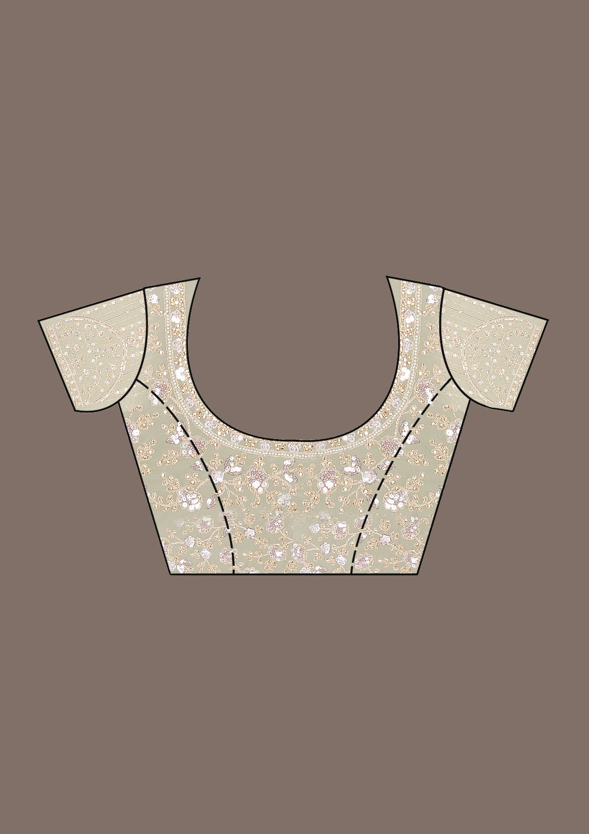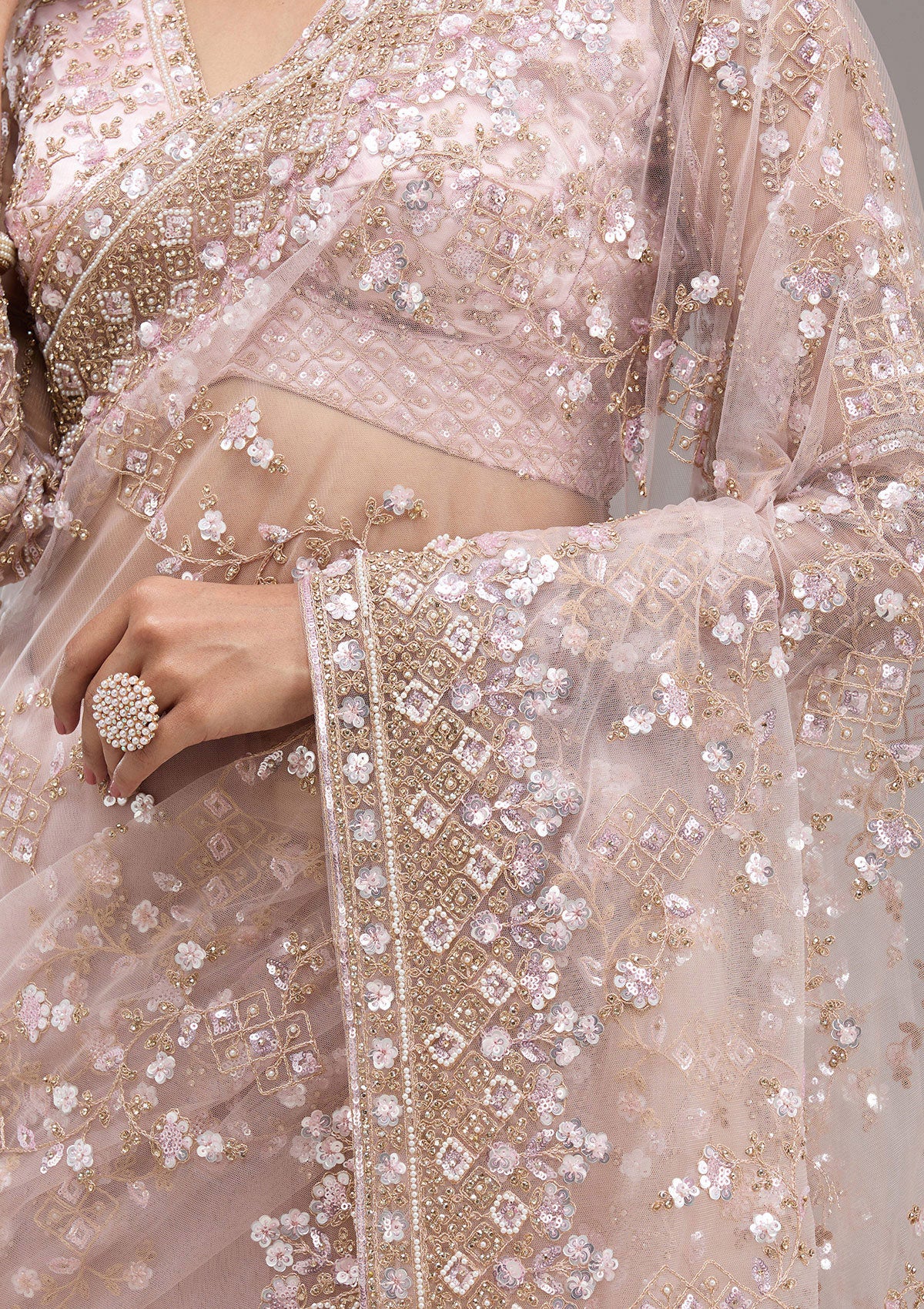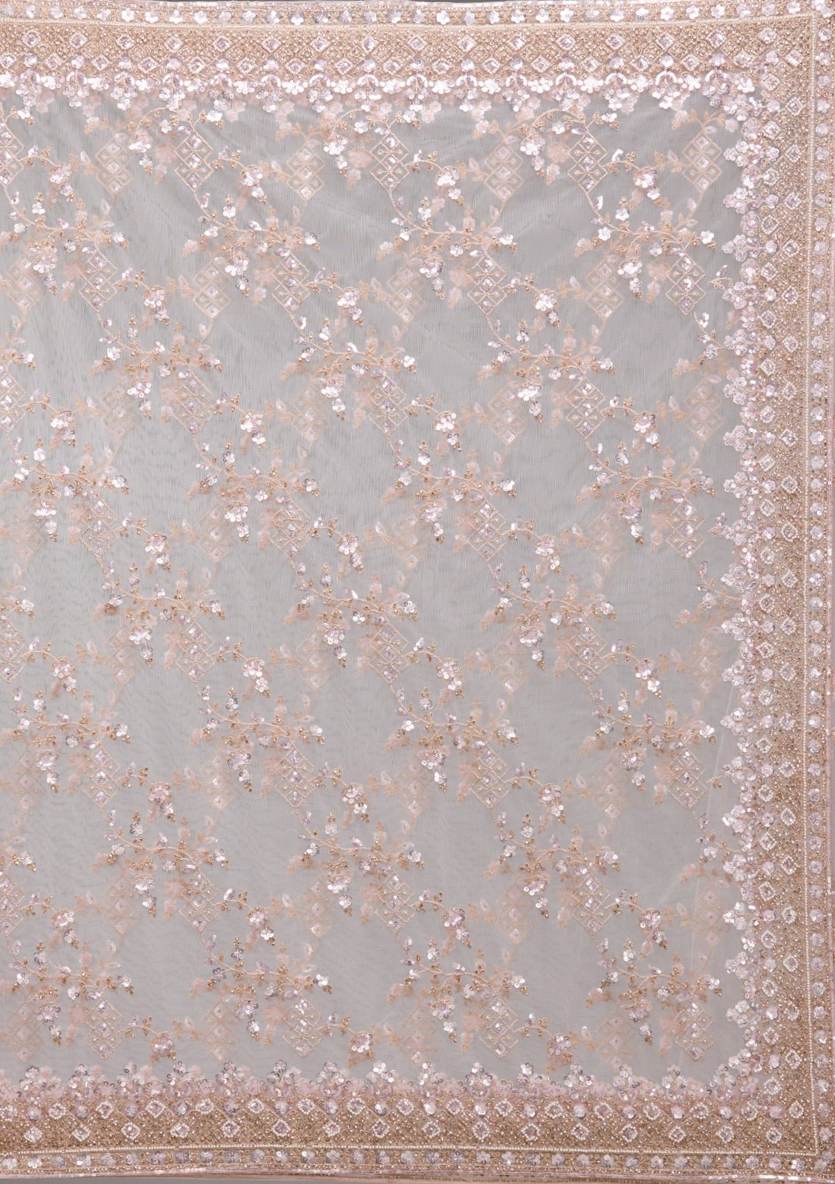 Dazzle and shimmer in the Koskii Beige Net Saree, where every drape glimmers with life! Designed for the fashionista who loves to sparkle, this saree features luxurious net fabric meticulously adorned with radiant sequin embroidery. It's not just a garment; it's a playground for your vibrant personality to dance under the limelight at every gala or gathering.
