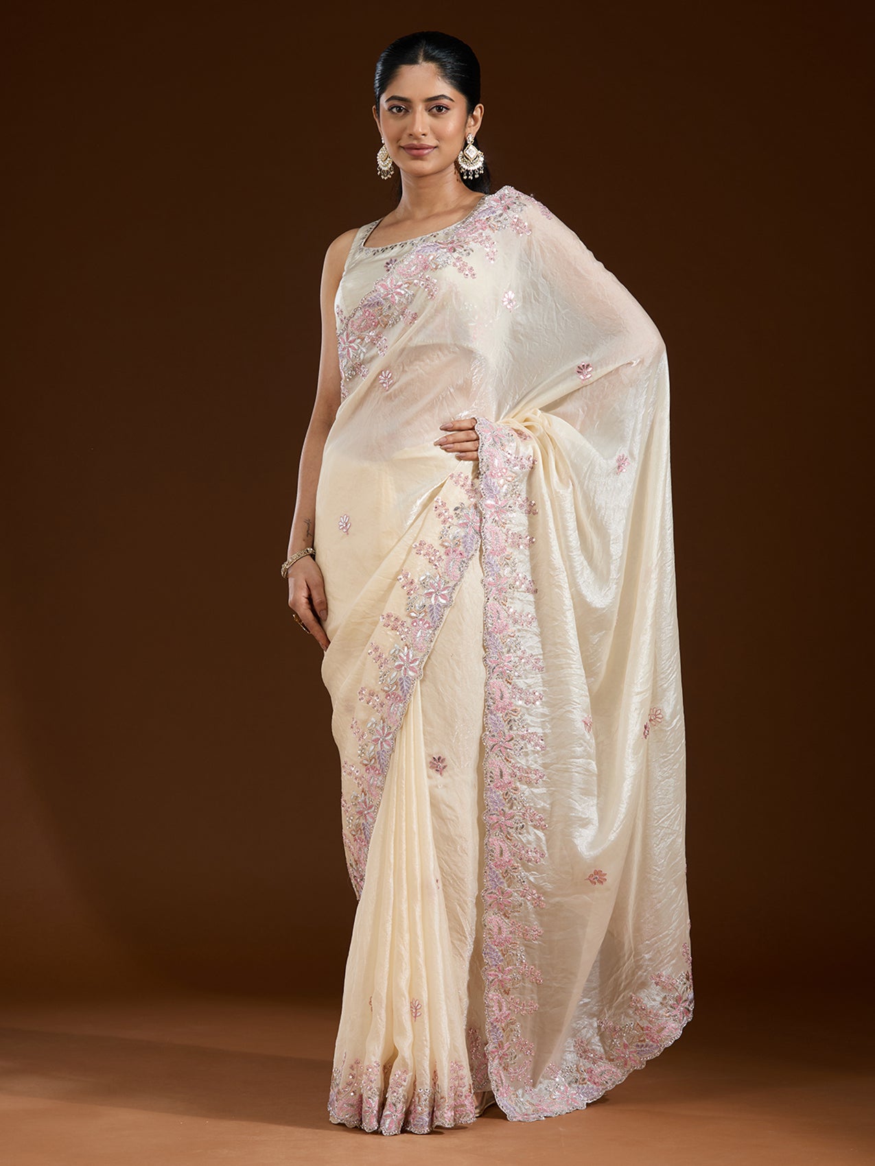 Cream Saree in Satin fabric The Saree is elevated with Gotapatti embroidery It comes with an Unstitched blouse Comes with the Koskii promise of premium quality.