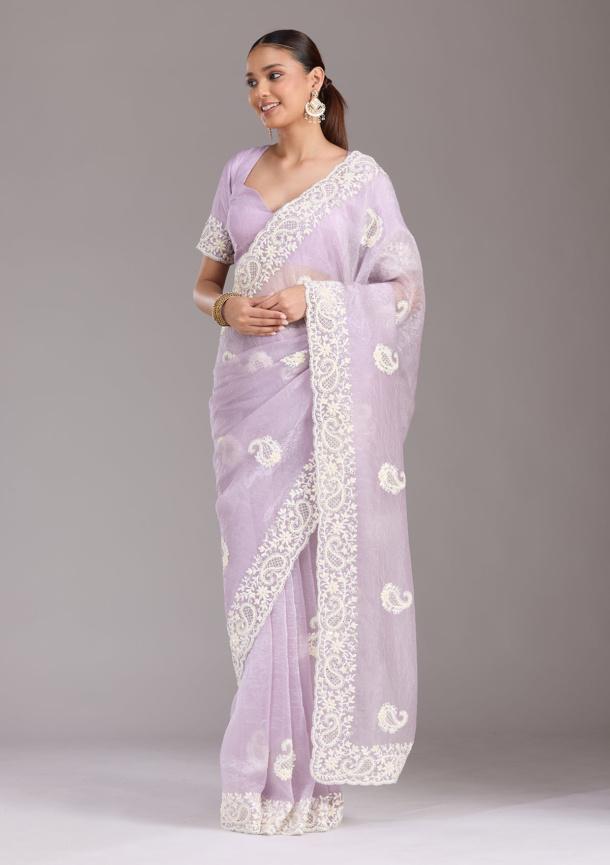 Lavender Saree in Tissue fabric. The Saree is elevated with Pearlwork embroidery. It comes with an Unstitched blouse. Comes with the Koskii promise of premium quality.