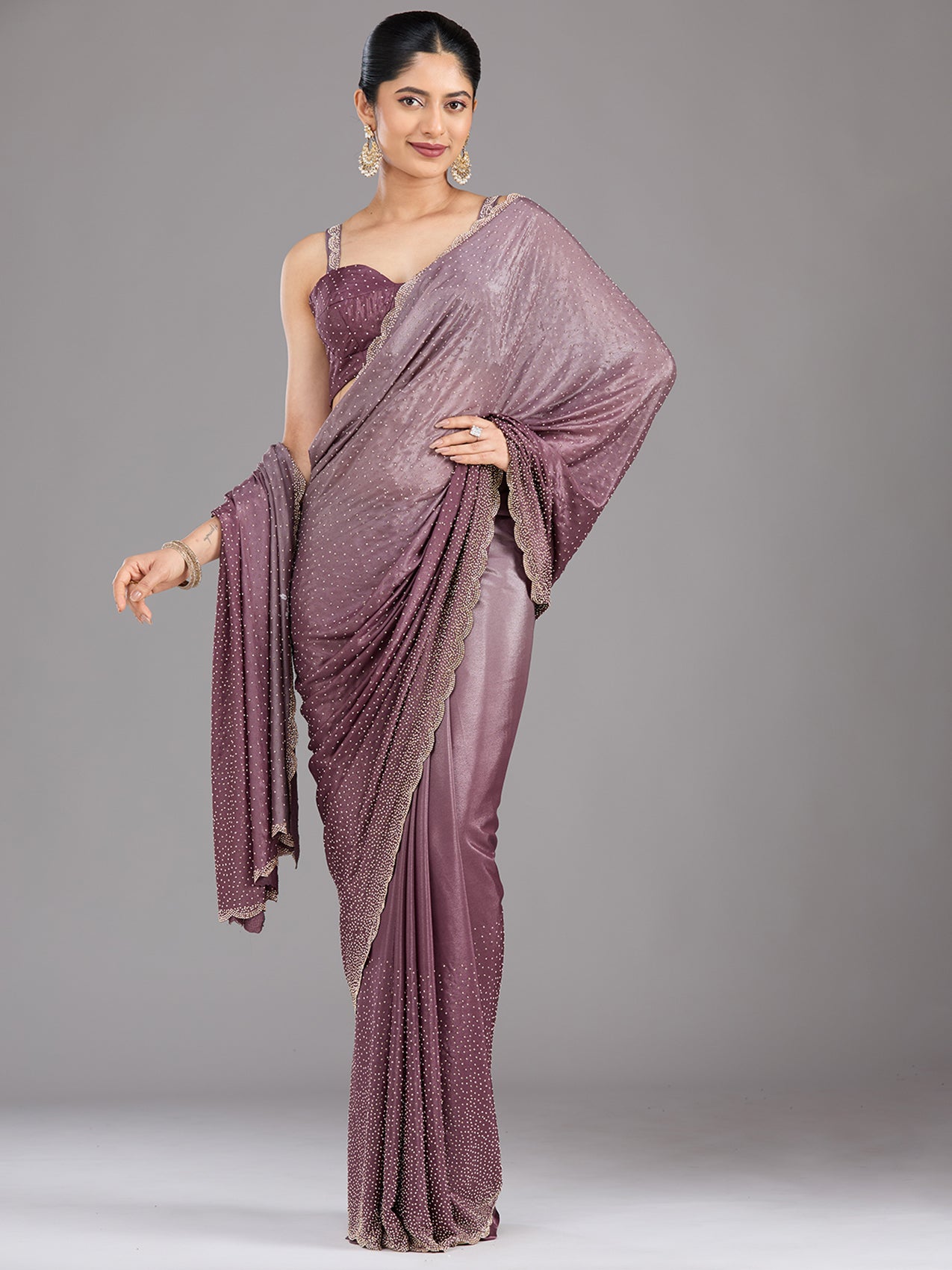 Lavender Saree in Satin fabric. The Saree is elevated with Stonework (Gold) embroidery. It comes with an Unstitched blouse. Comes with the Koskii promise of premium quality.