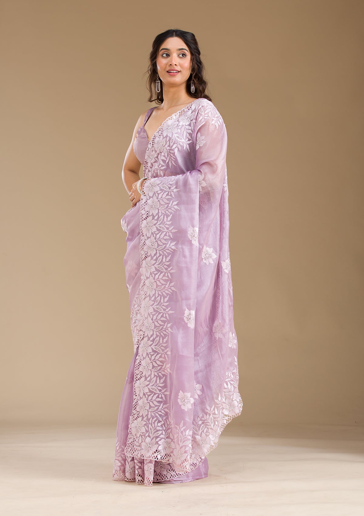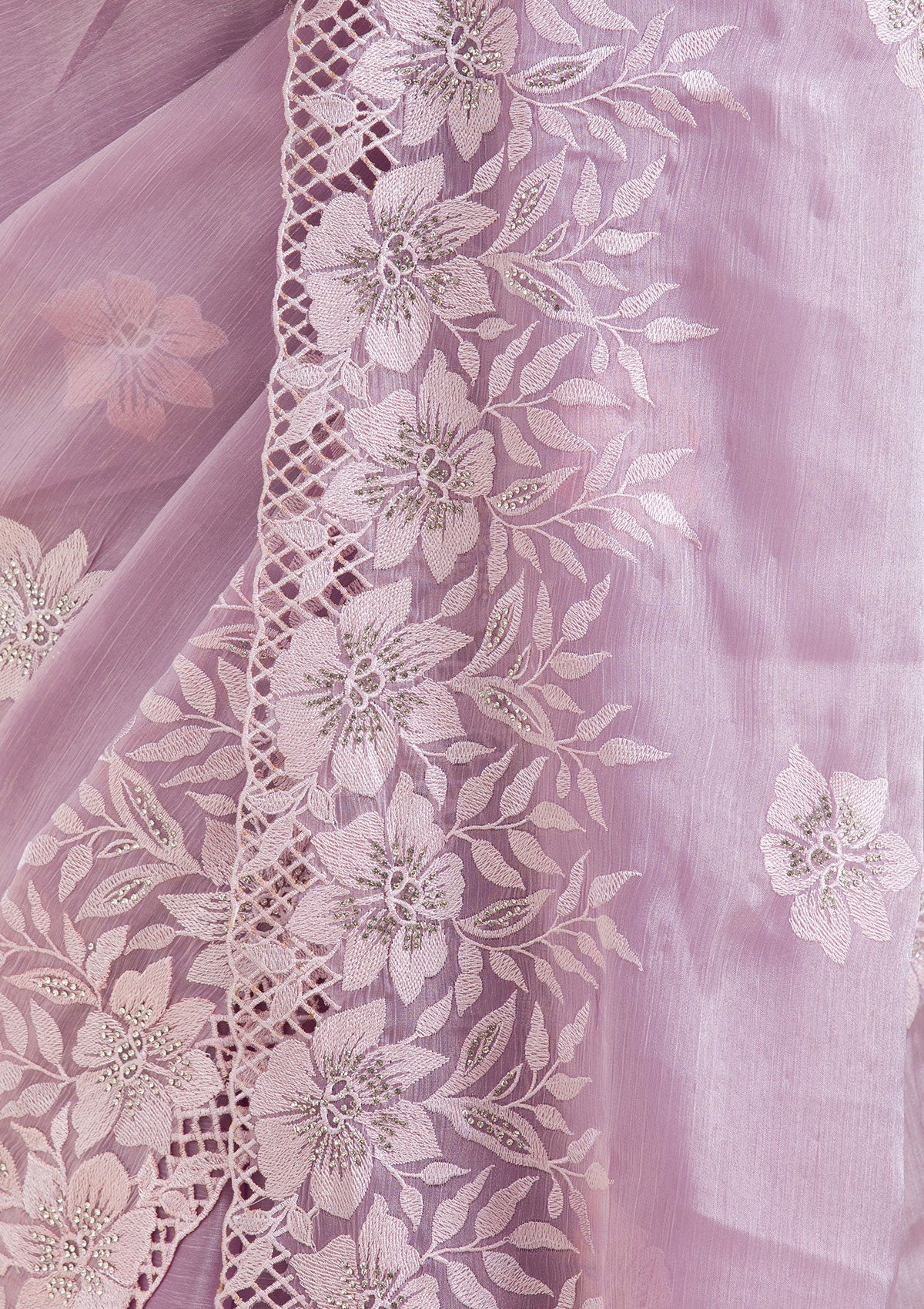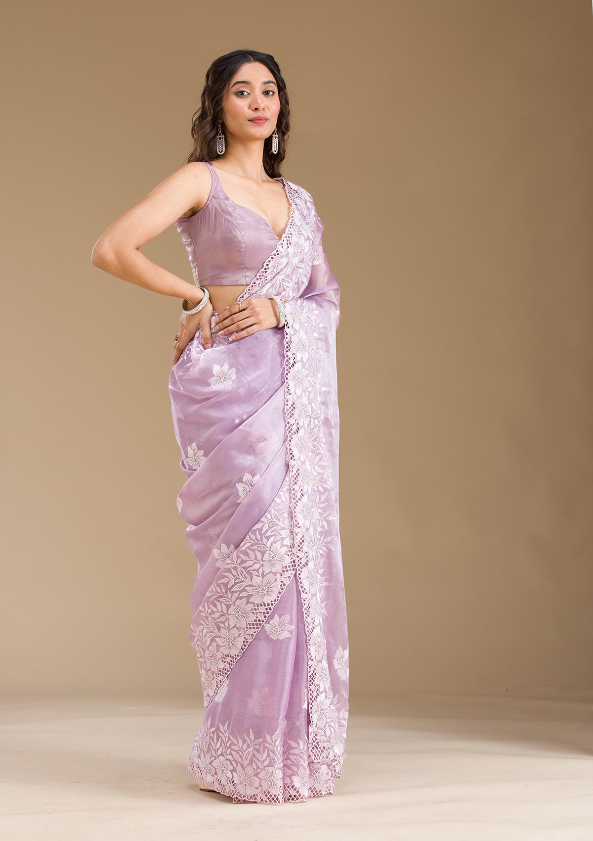 Lavender Saree in Tissue fabric The Saree is elevated with Stonework embroidery It comes with an Unstitched blouse Comes with the Koskii promise of premium quality.