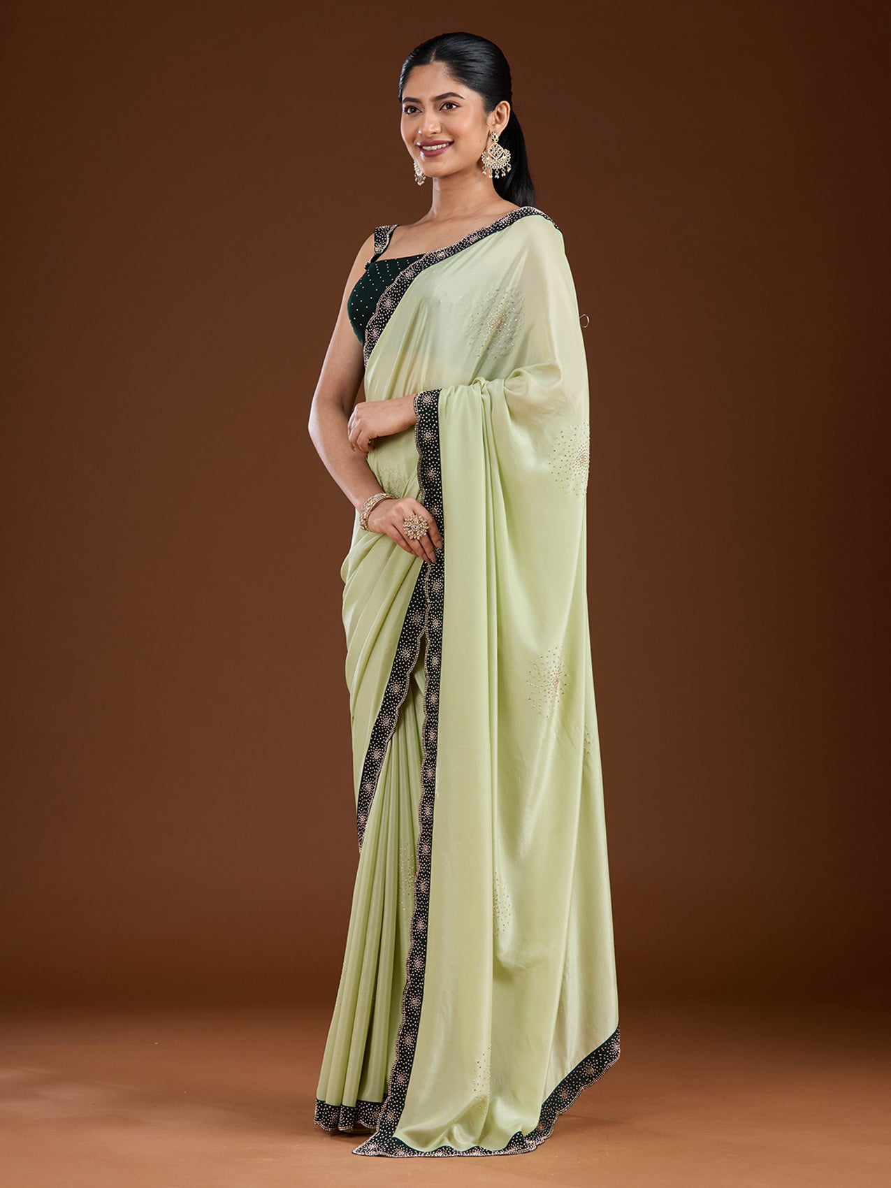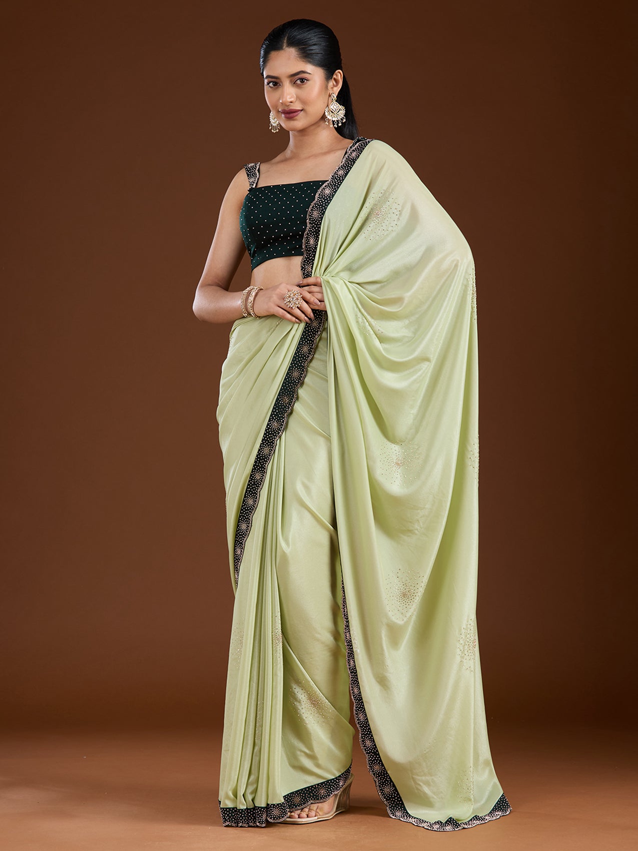 Pista Green Saree in Velvet fabric. The Saree is elevated with Stonework (Silver) embroidery. It comes with an Unstitched blouse. Comes with the Koskii promise of premium quality.