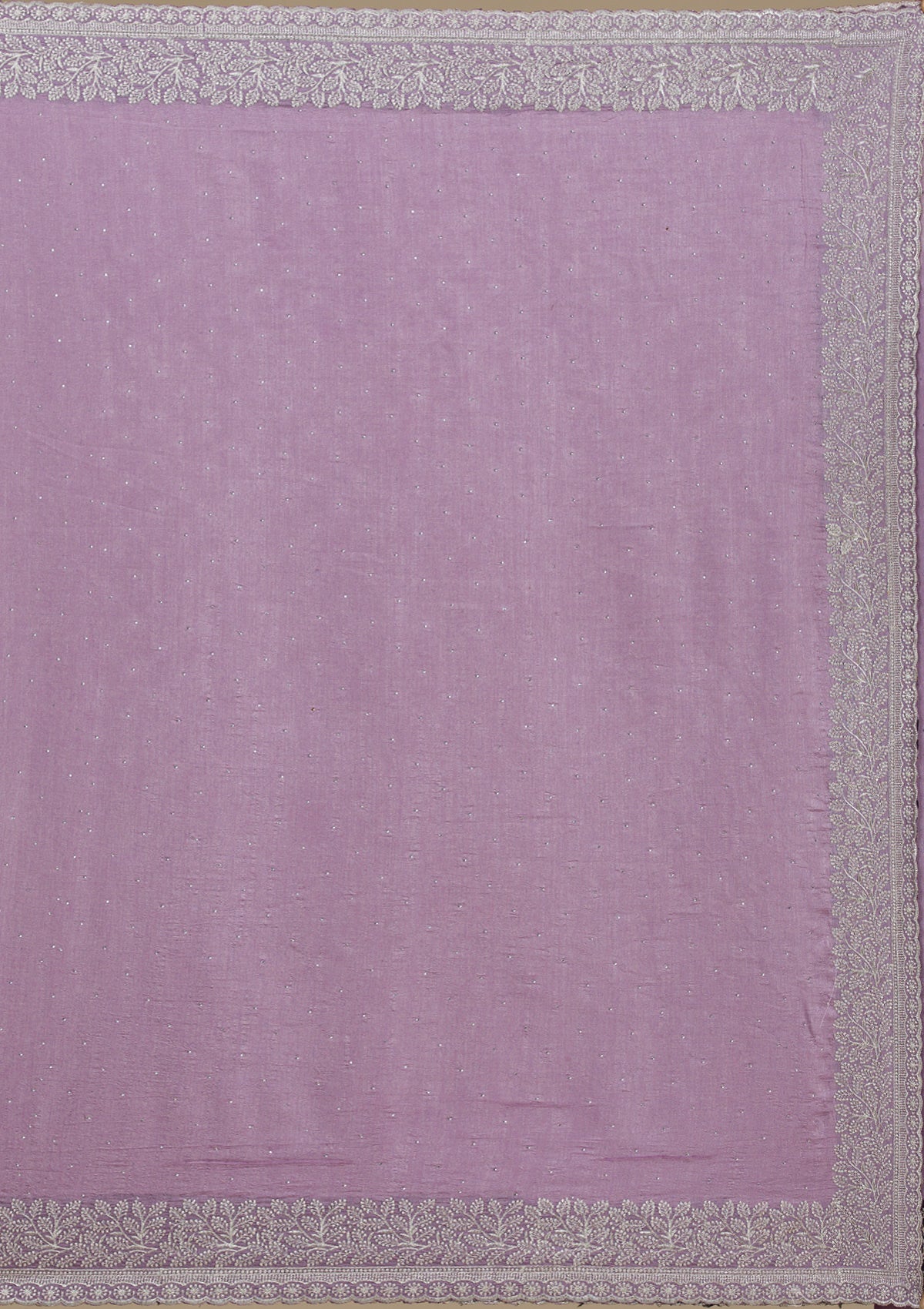 A woman modeling a purple saree with silver zariwork, showcasing the fabric and design.