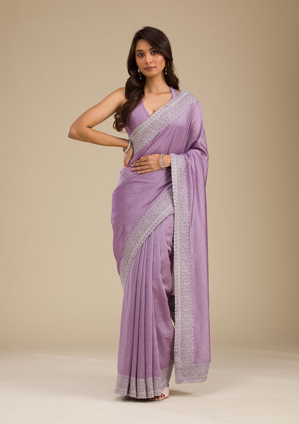 Unveil the diva in you with Koskii's Lavender Saree, a masterpiece crafted from luxurious soft raw silk that whispers tales of elegance. This delicately woven treasure shines bright with exquisite silver zariwork, ensuring you glow at every turn. Whether stepping out for an evening soiree or a festive gathering, this saree promises to wrap you in unmatched grace and the festive sparkle of tradition reimagined.