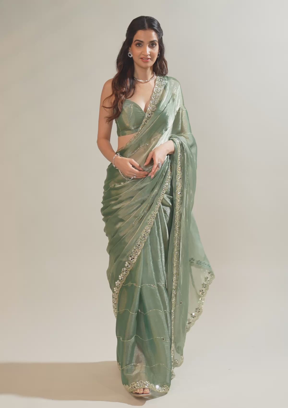 Sea Green Mirrorwork Organza Saree