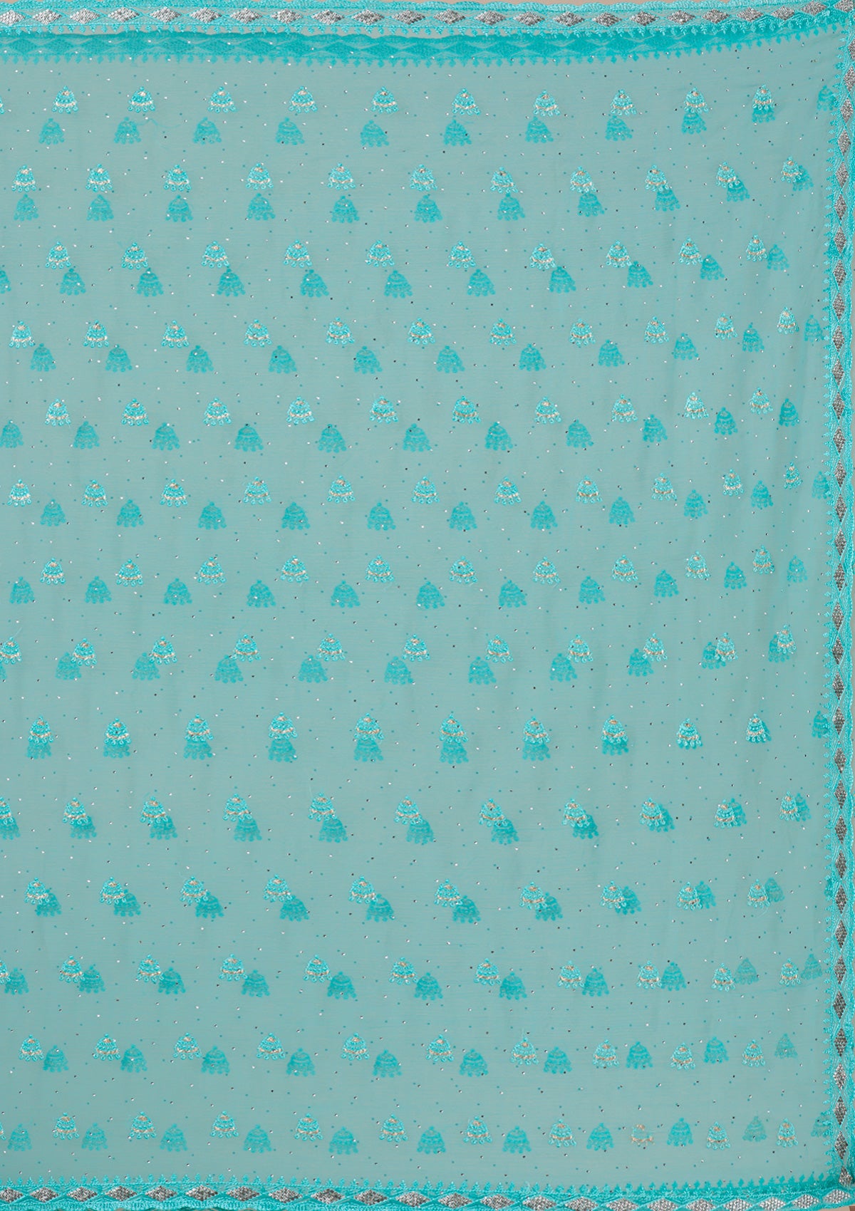 Dive into the world of vibrant elegance with Koskii's turquoise chiffon saree, adorned with exquisite threadwork that dances across the fabric in playful motifs. This saree promises an ensemble that's as breezy as it is beautiful, perfect for making a bright statement at any celebratory gathering or elegant event. Embrace the charm of chiffon and let your spirit shine in every swirl and twirl!.