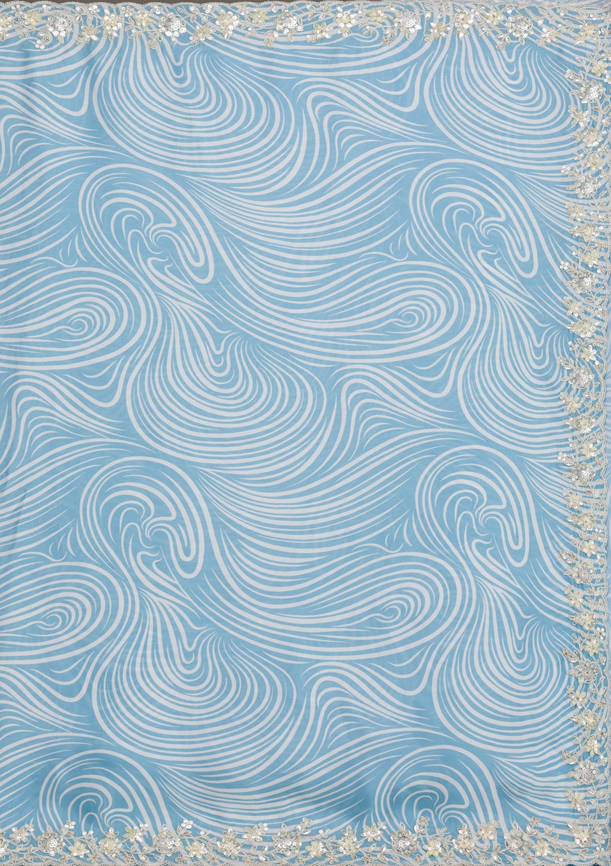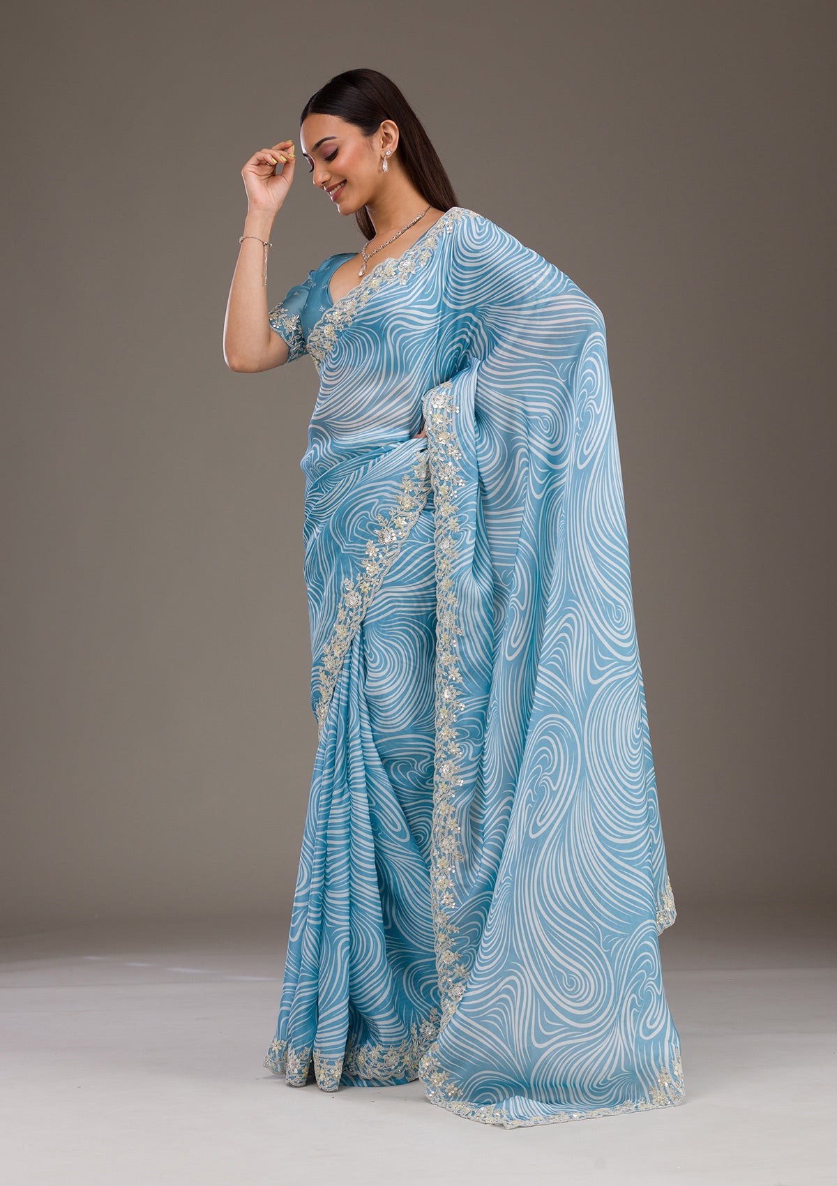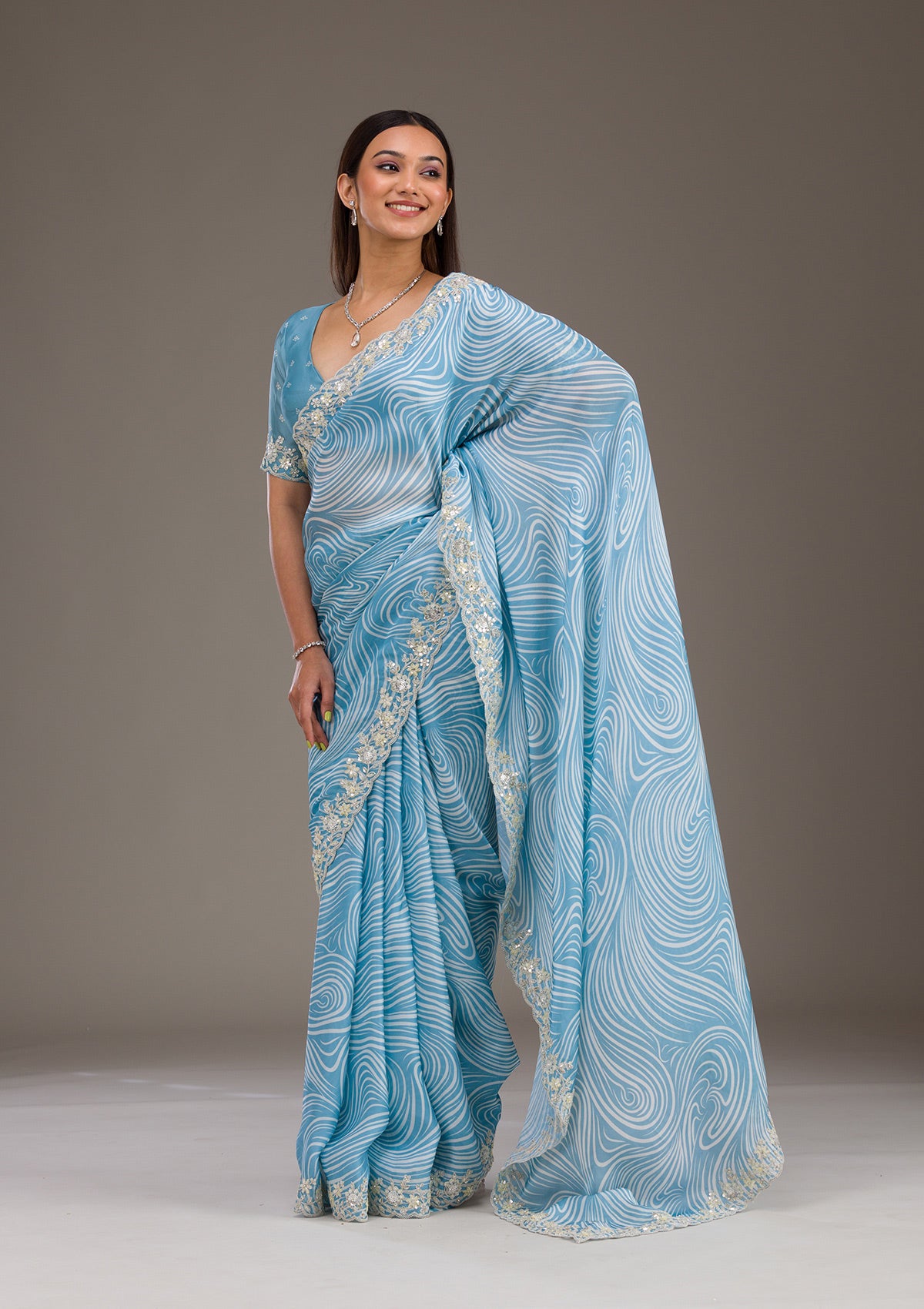 Sky Blue Saree in Georgette fabric. The Saree is elevated with Zariwork embroidery. It comes with an Unstitched blouse. Comes with the Koskii promise of premium quality.