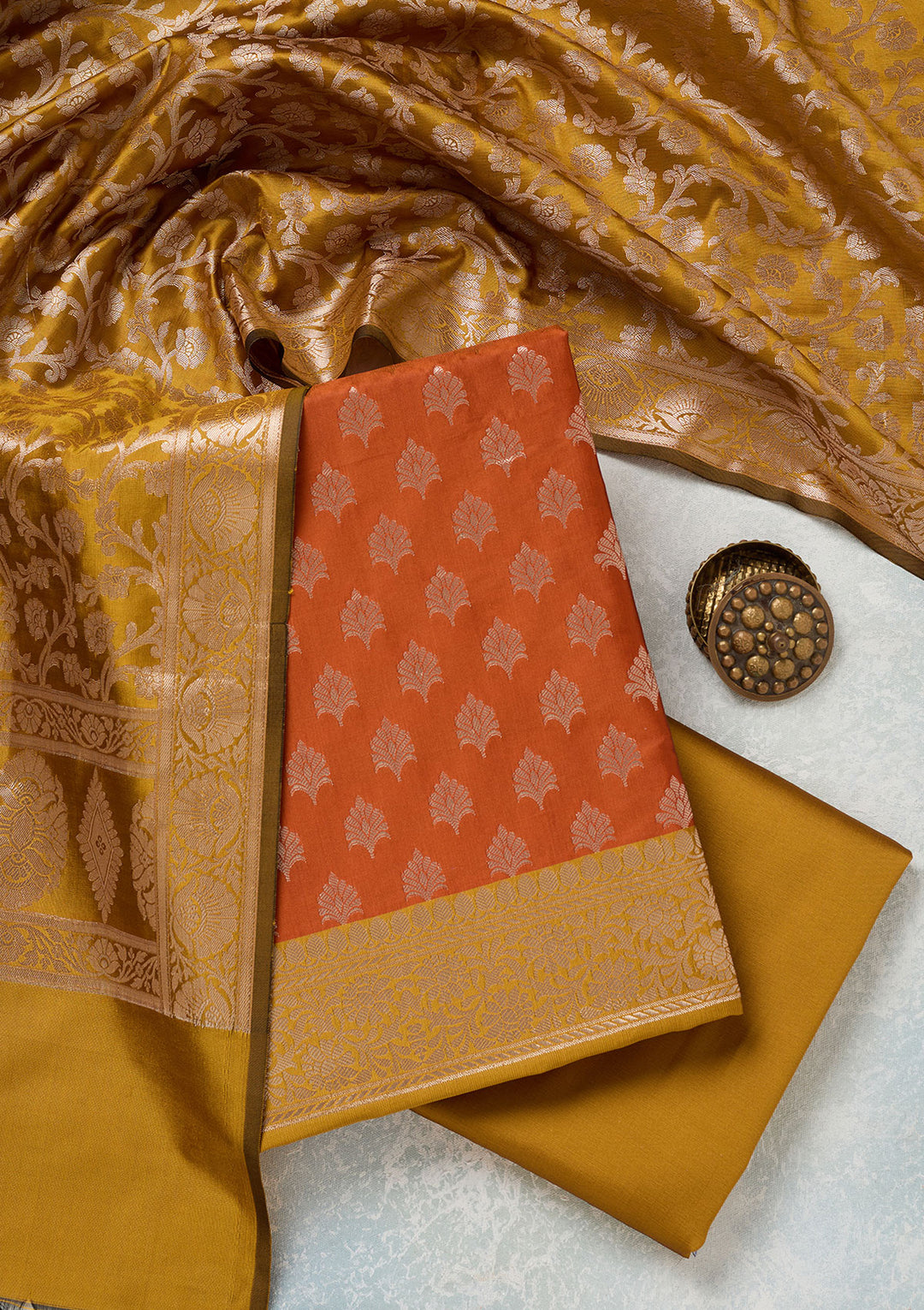 | Rust Zariwork (Gold) Dola Silk Unstitched Salwar Suit | ₹ 1,992 | |