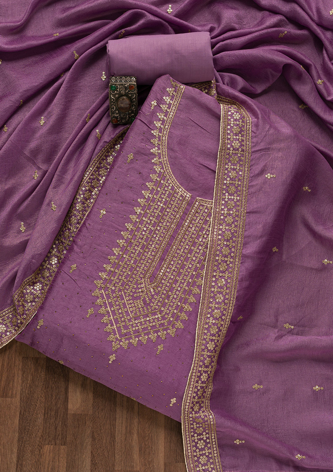 If you love ethnic wear but want it stitched in a specific style only, then unstitched suits are what you need. These are nothing but dress material, cut and ready for the sewing machine. The suit material comes with all the glitzy, shimmering embellishments you need to look like a queen.