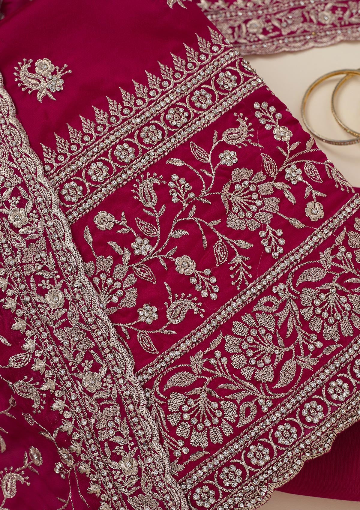Rani Pink Salwar Suit in Semi Crepe fabric. The Salwar Suit is embellished with Zariwork (Silver) embroidery. Accompanied with a bottom and dupatta. Comes with the Koskii promise of premium quality.
