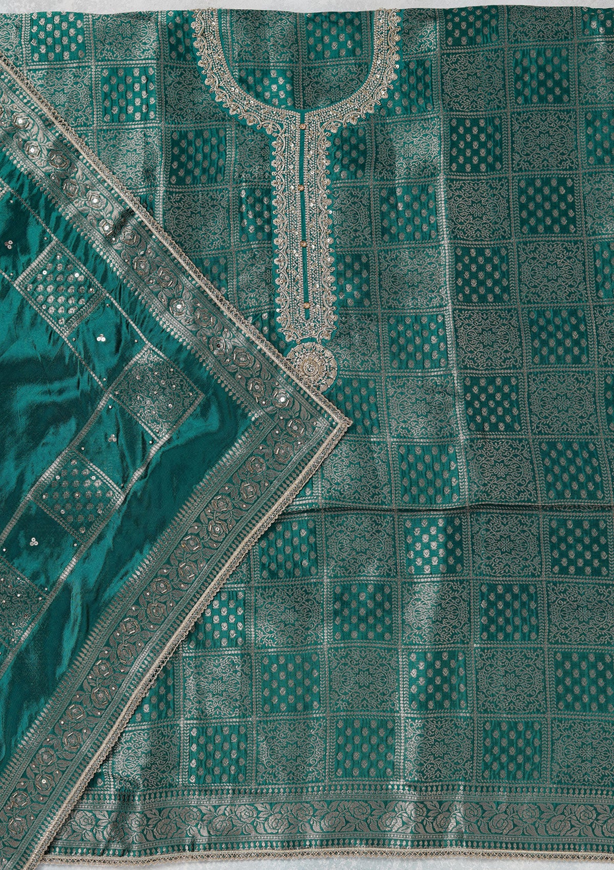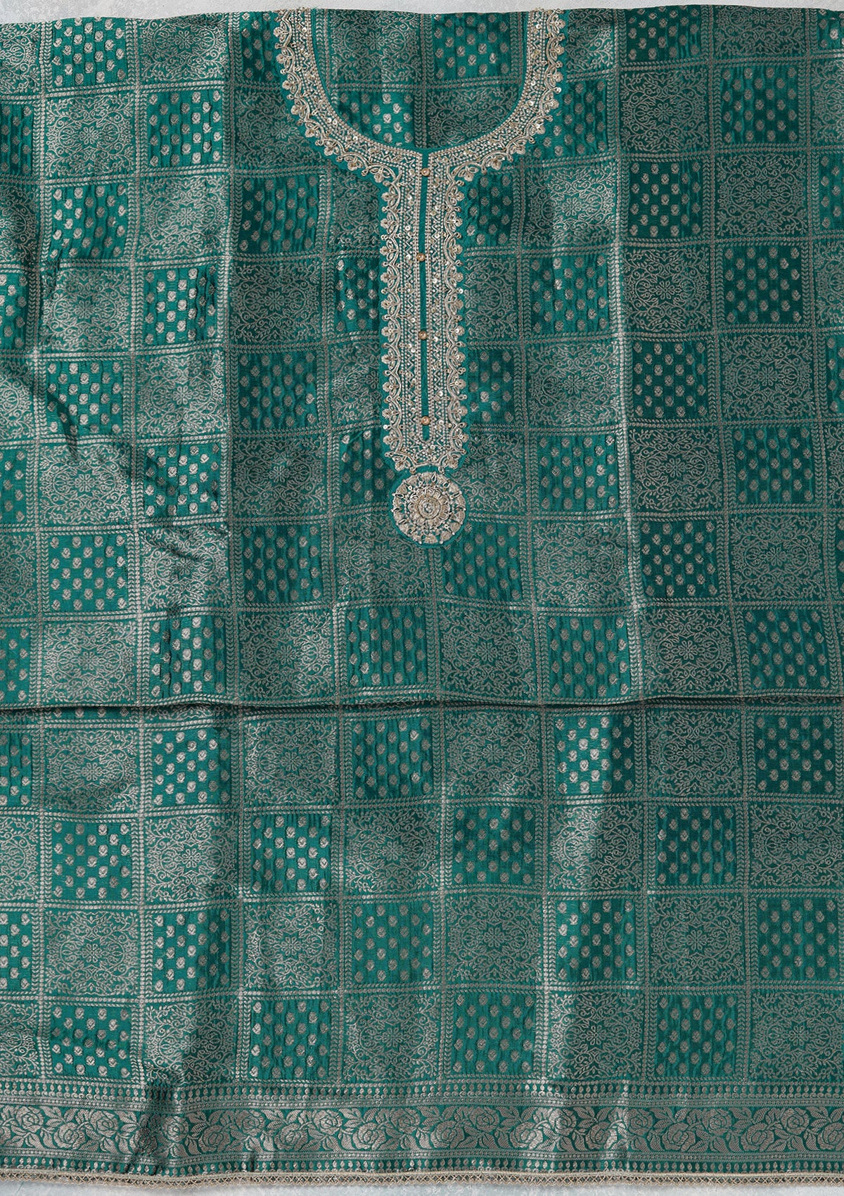 Turquoise Blue Zariwork (Gold) Brocade Unstitched Salwar Suit