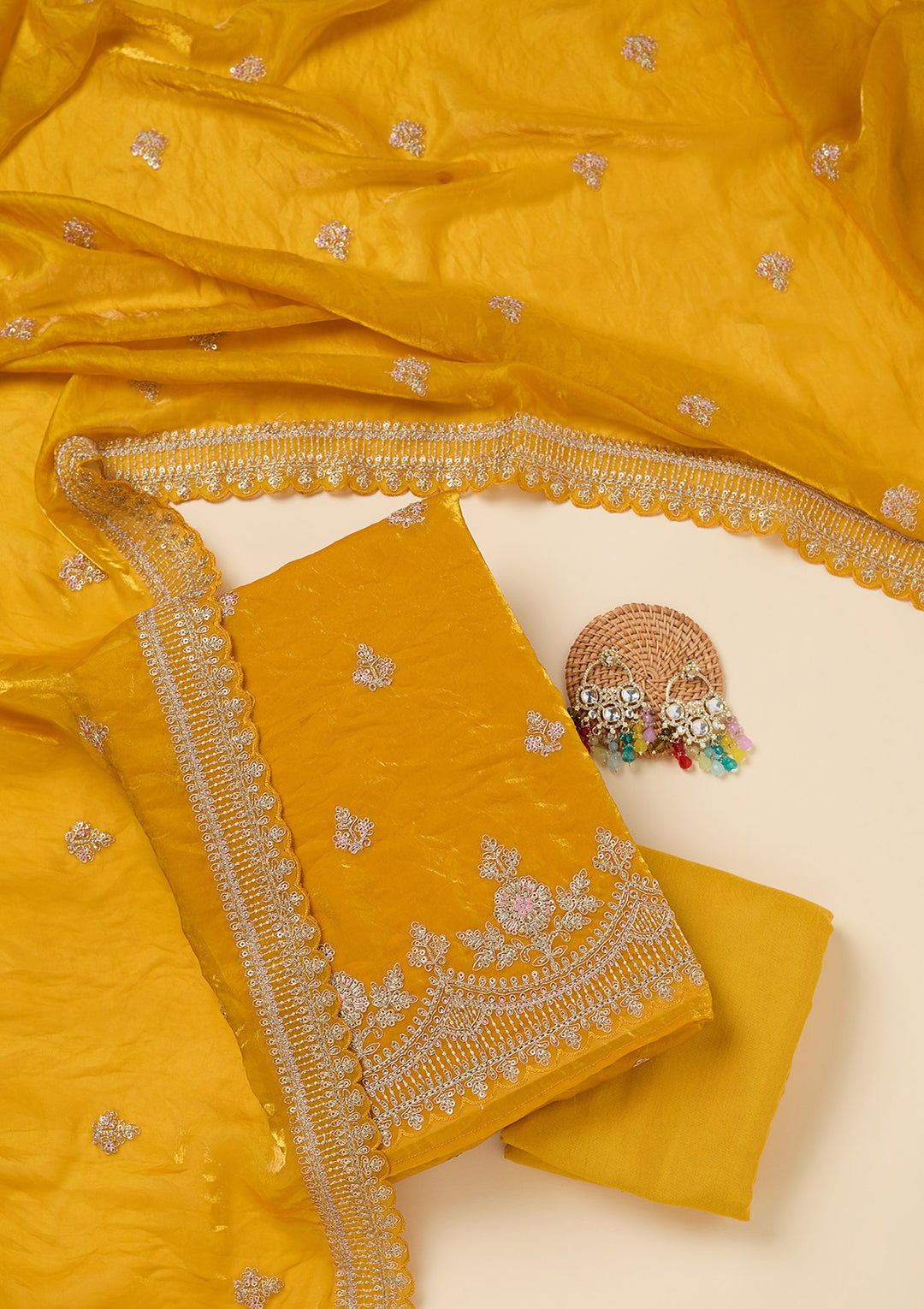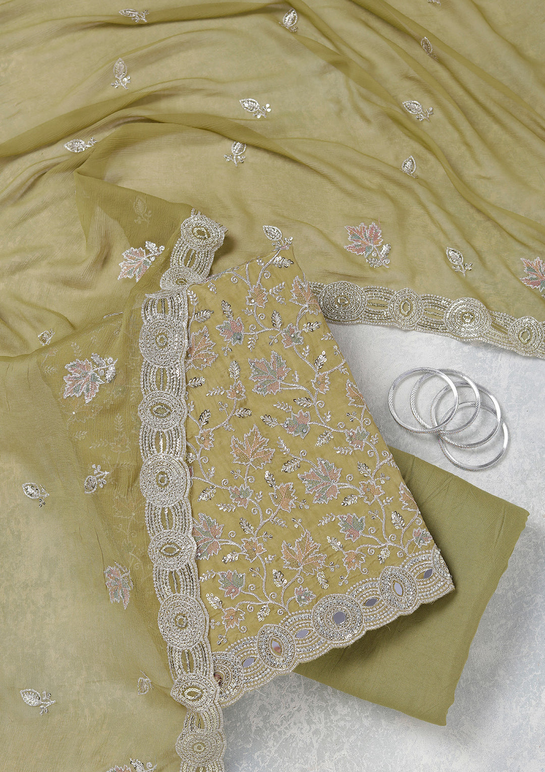 | Mehendi Mirrorwork Organza Unstitched Salwar Suit | ₹ 3,592 | |