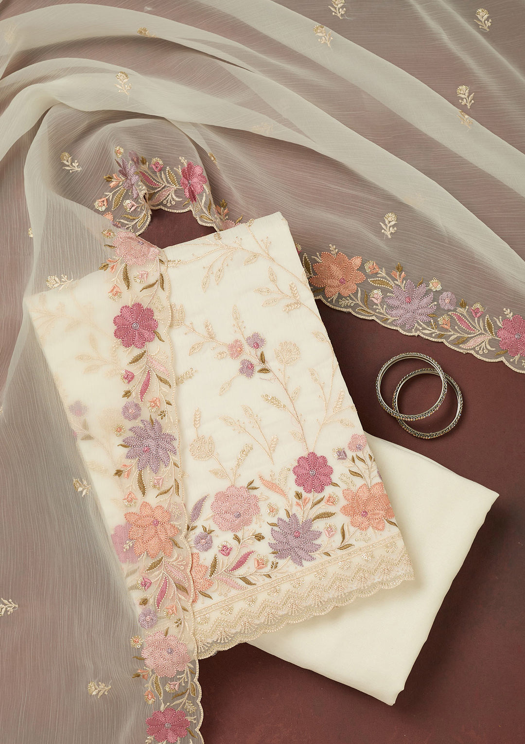 Georgette is soft and lightweight, which makes it one of the most comfortable fabrics for creating any ethnic or casual outfit. At Koskii, you will find georgette dress material for women in captivating designs within your budget. Try the onion pink zari work shimmer georgette unstitched suit with a matching dupatta for a classic salwar suit style, or convert the cream thread work suit piece into a lovely sharara suit.