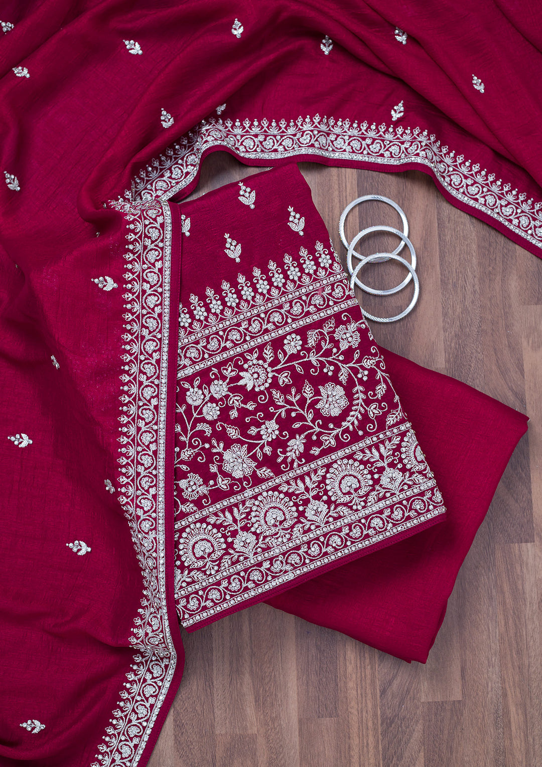 Women prefer silk dress material due to their glistening look and comfortable feel. At Koskii, you will find a wide range of art silk materials designed with intricate embroideries and embellishments. Our maroon stonework art silk dress material can be made into a salwar suit that’s fit for a wedding.