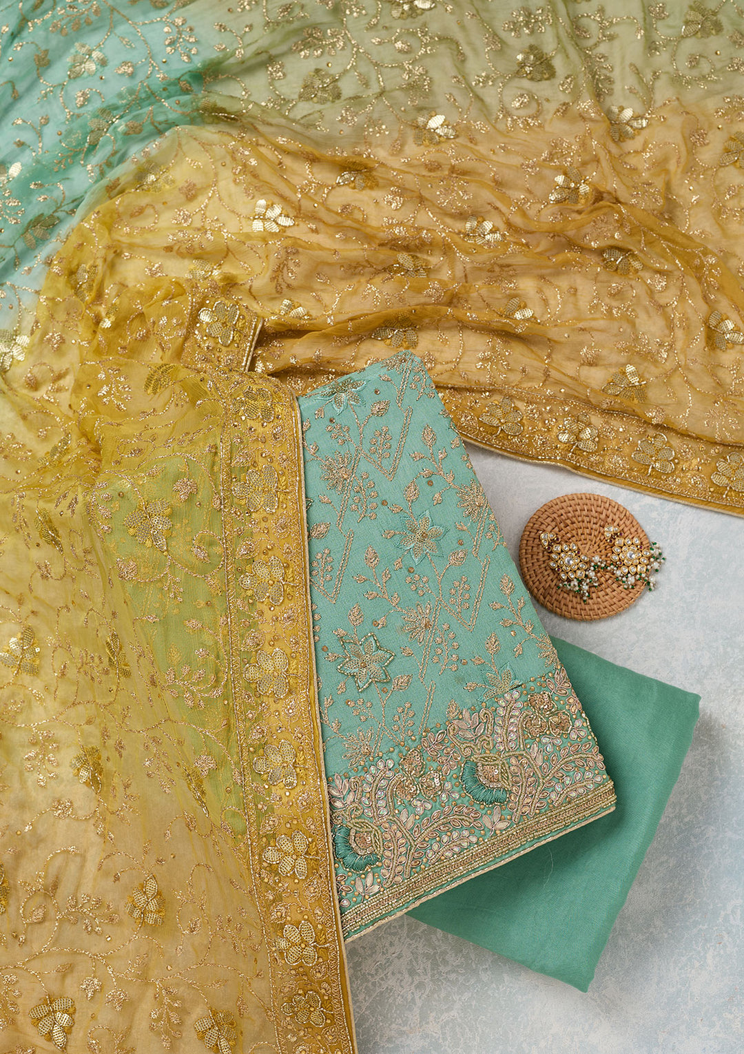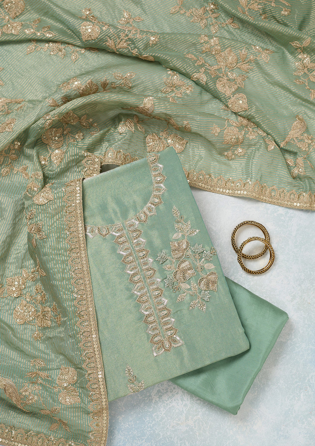 | Pista Green Threadwork Tissue Unstitched Salwar Suit | ₹ 5,192 | |