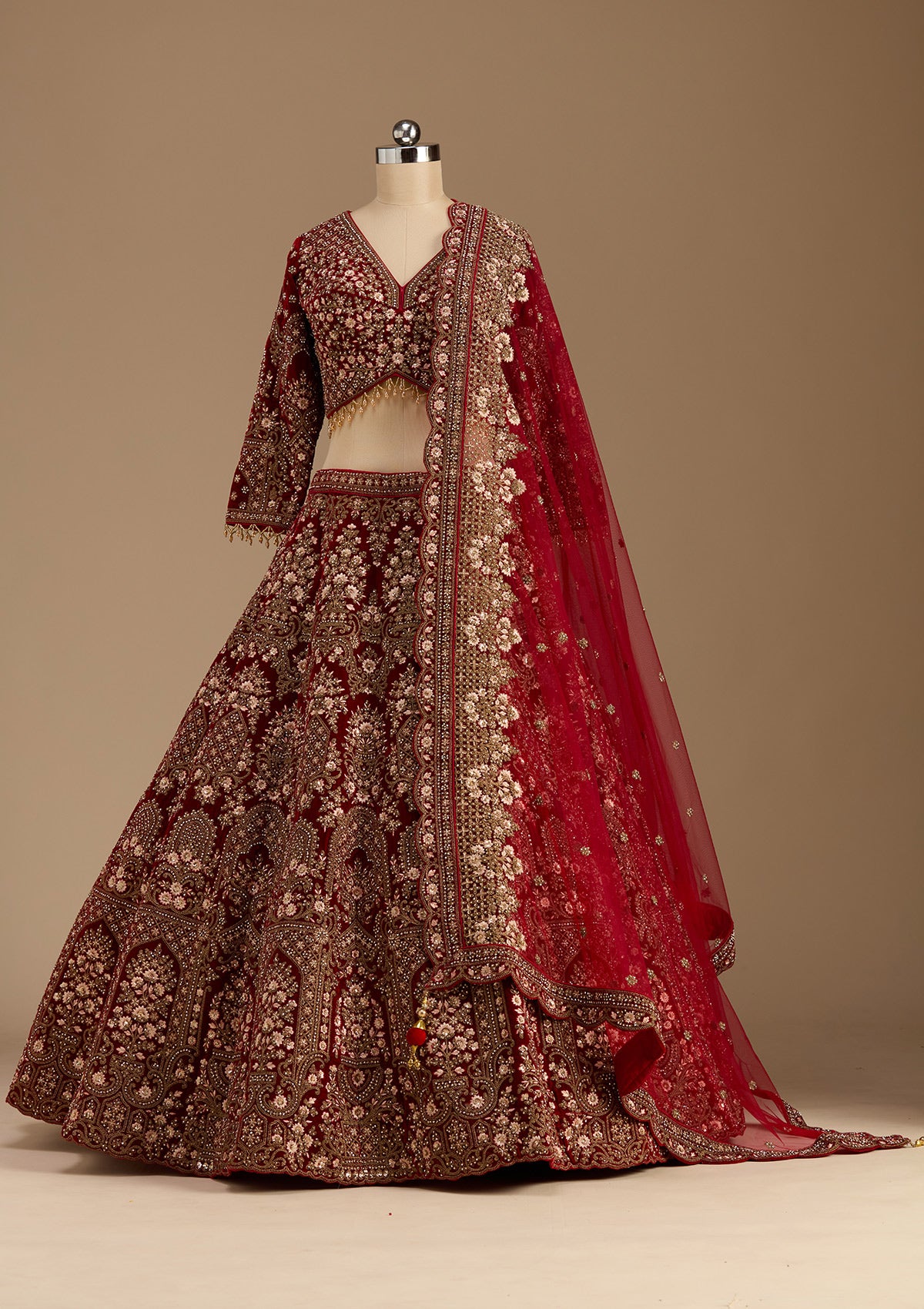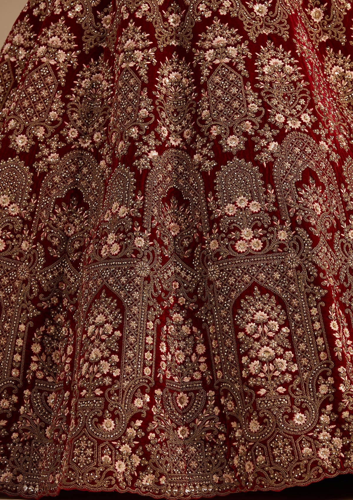 Maroon Readymade Lehenga in Velvet fabric The Lehenga is embellished with Cording embroidery Accompanied with an Readymade blouse and dupatta Comes with the Koskii promise of premium quality.