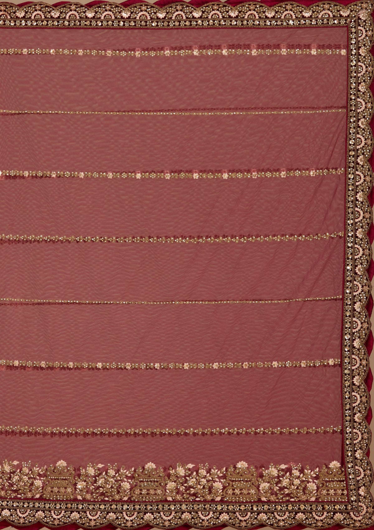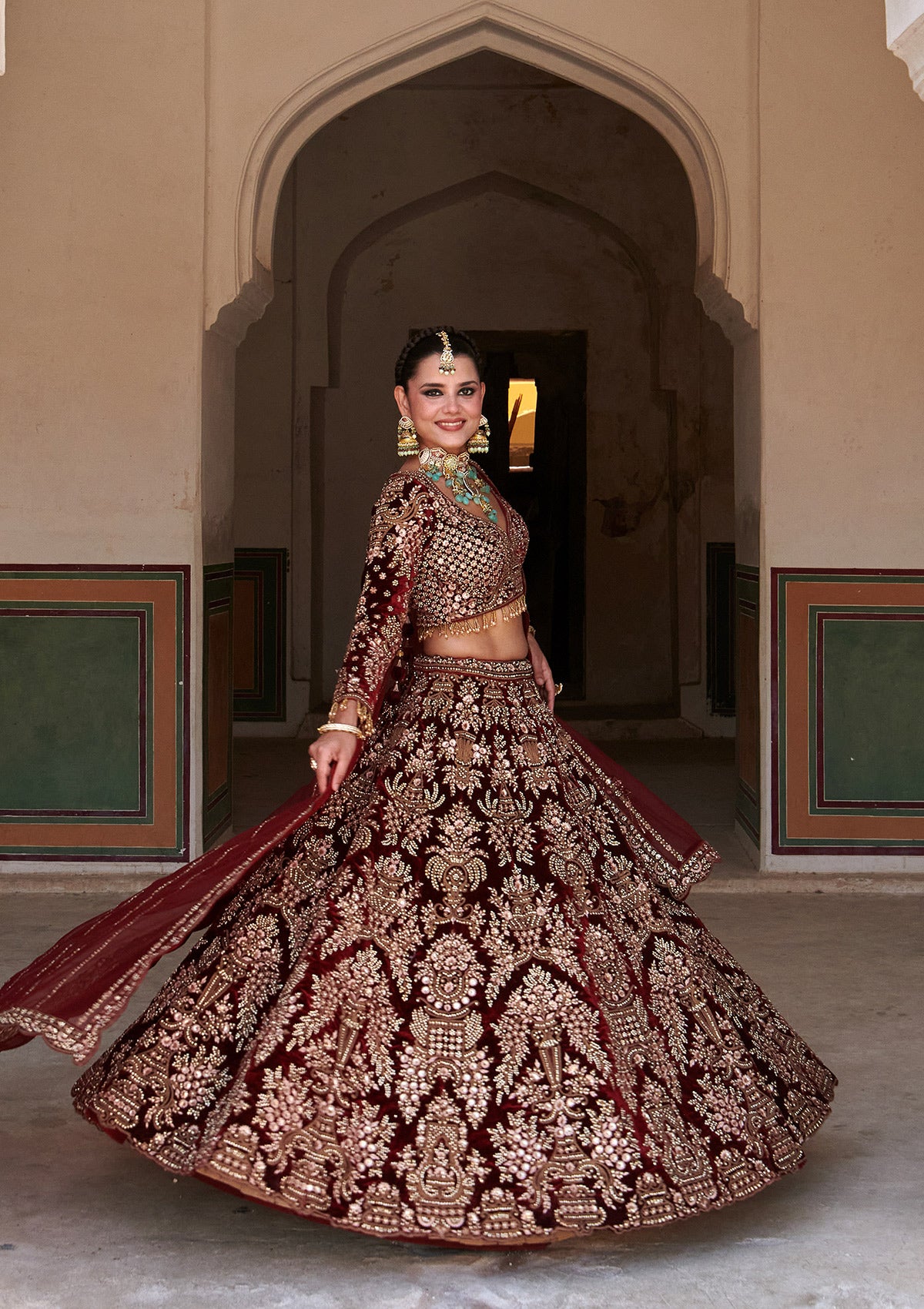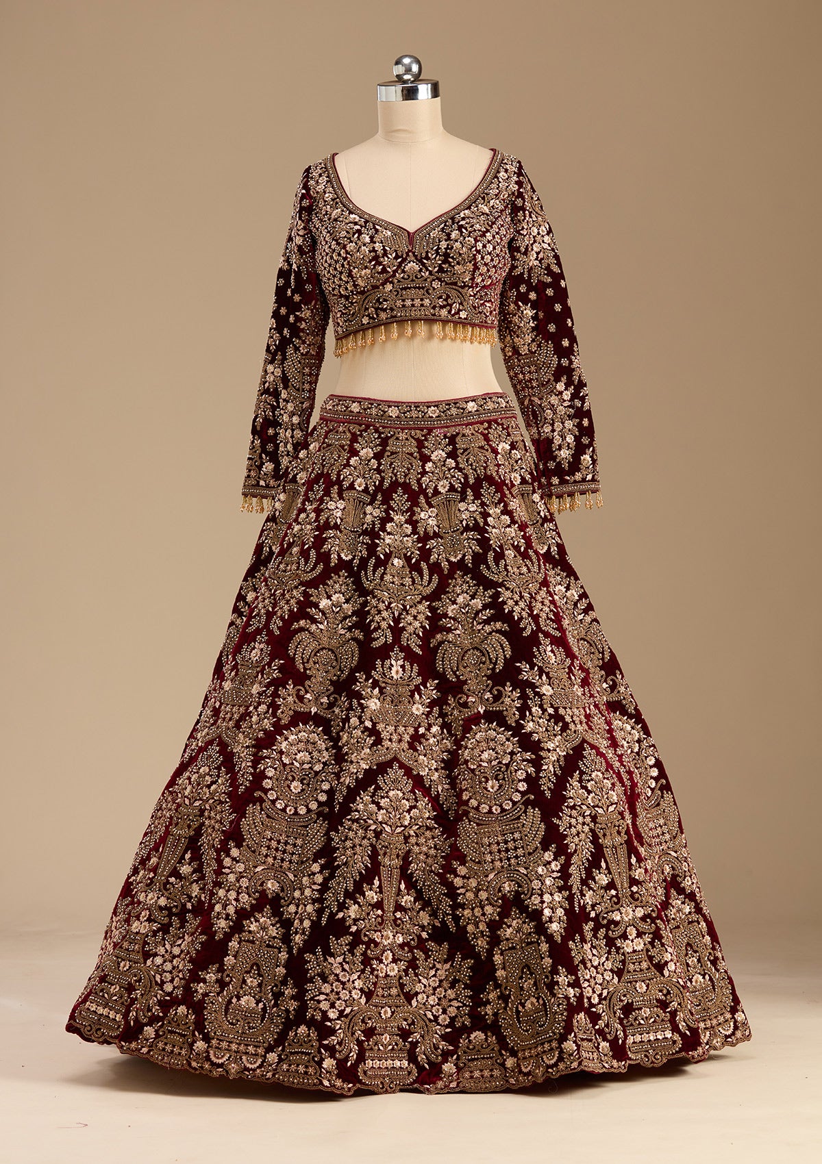 Maroon Readymade Lehenga in Velvet fabric. The Lehenga is embellished with Cording embroidery. Accompanied with an Readymade blouse and dupatta. Comes with the Koskii promise of premium quality.
