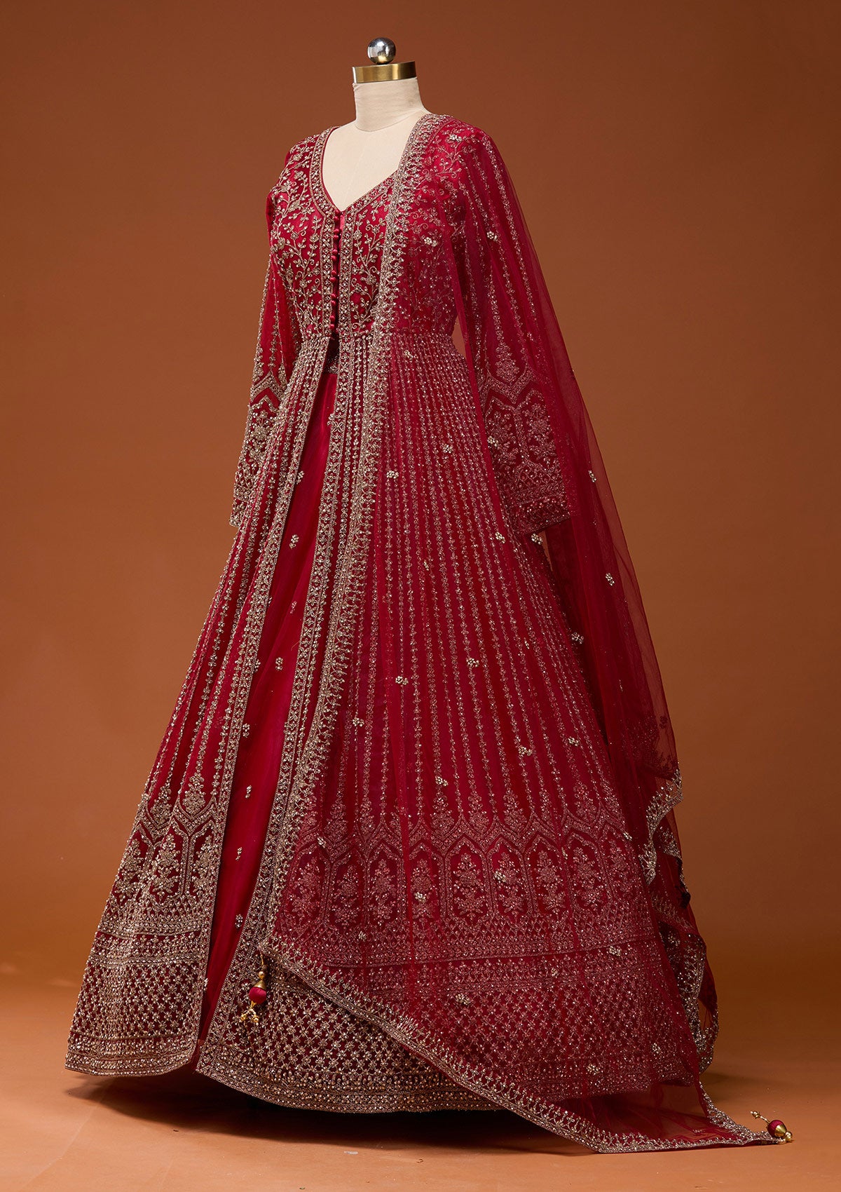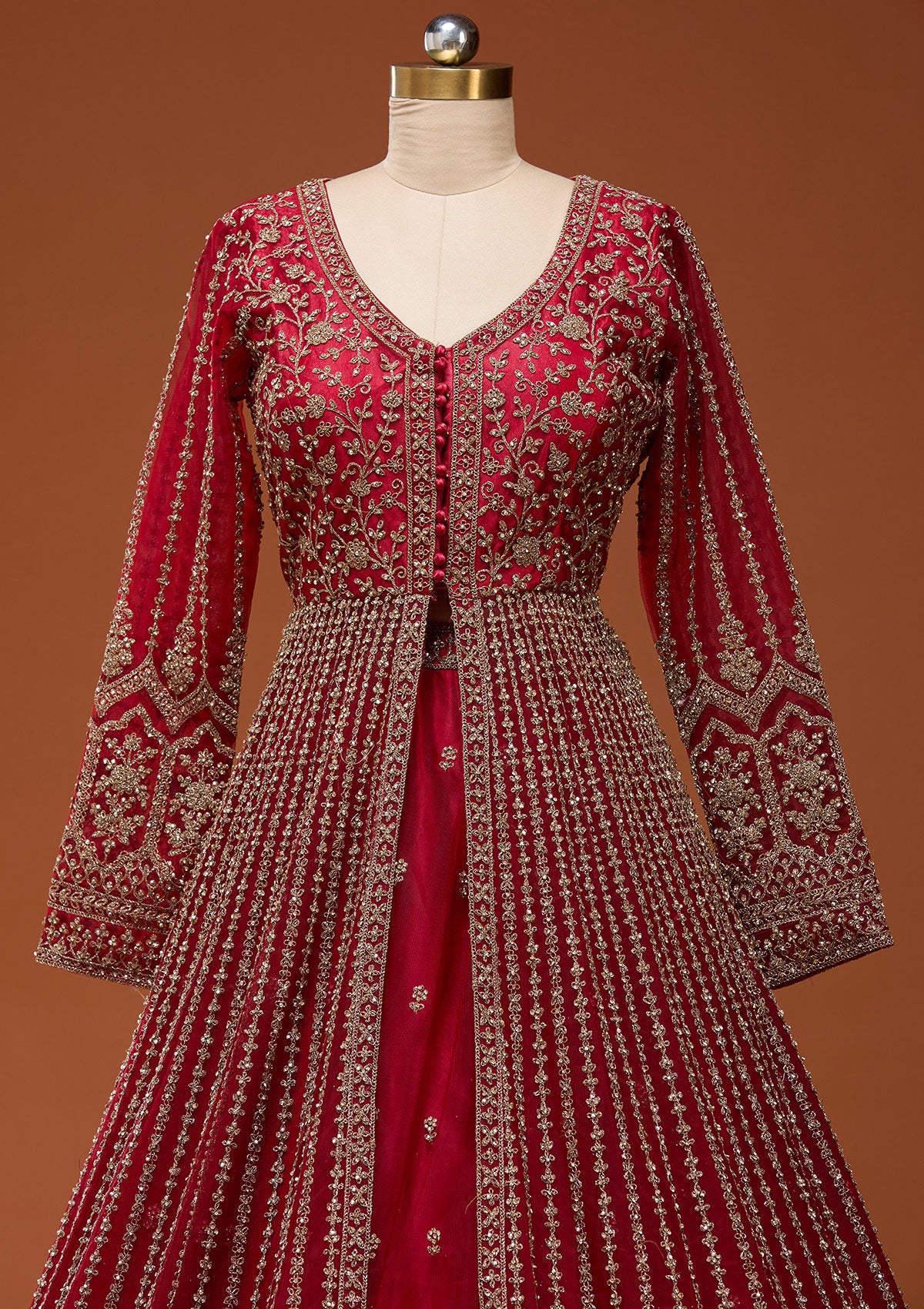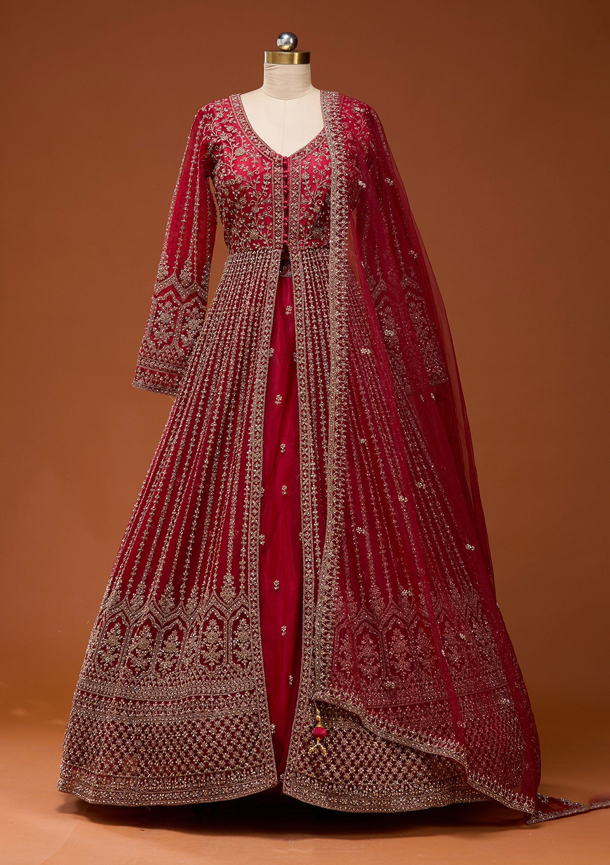 Step into your fairy tale in this dazzling Koskii Red Net Lehenga, where every step glimmers with the magic of stonework embroidery! Crafted from luxurious net fabric, this piece wraps you in a cloud of elegance, celebrating every curve with its exquisite detailing. Perfect for the bride who loves to radiate confidence and charm, this lehenga promises a majestic entrance that's lively, unforgettable, and distinctly you!