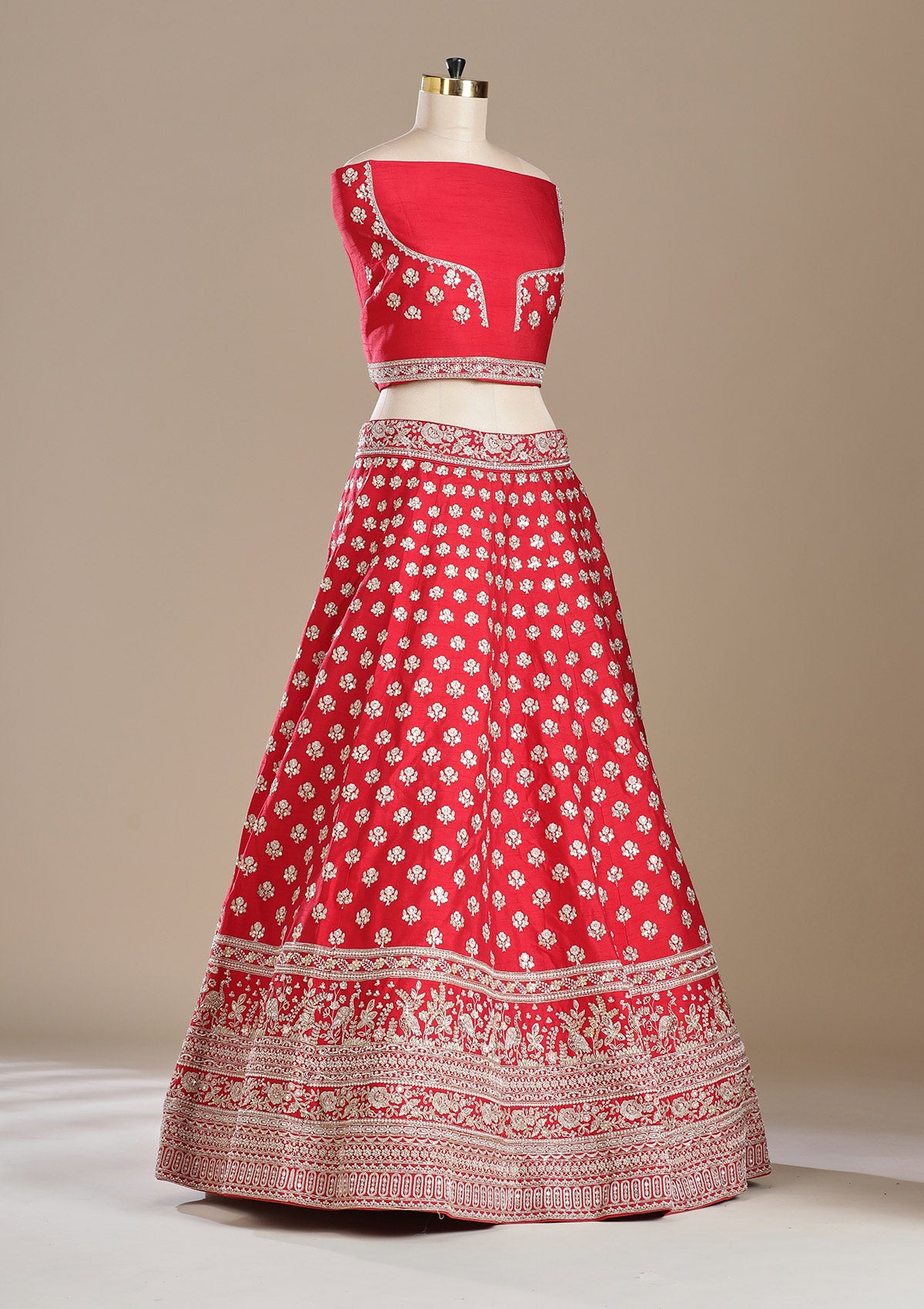 Maroon Readymade Lehenga in Raw Silk fabric. The Lehenga is embellished with Zardozi (Gold) embroidery. Accompanied with an Readymade blouse and dupatta. Comes with the Koskii promise of premium quality.