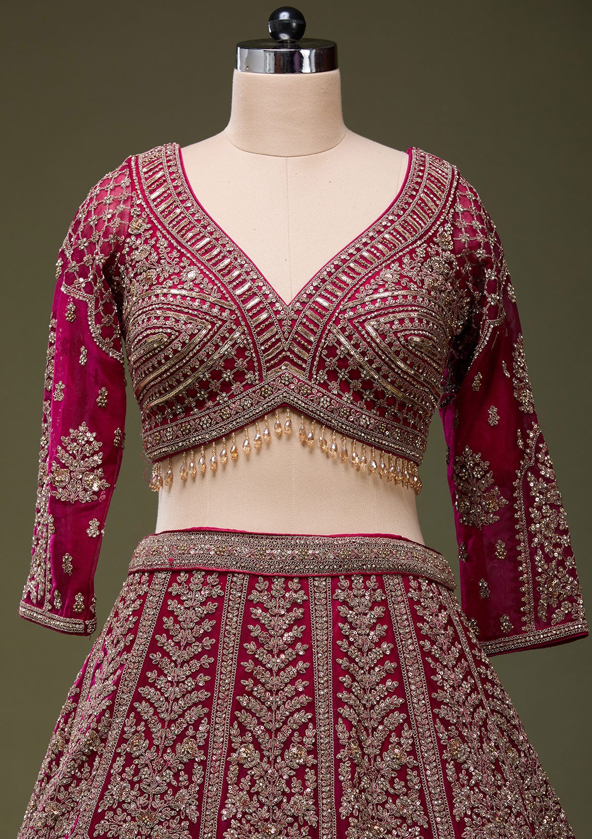Dive into the world of shimmer and elegance with Koskii’s Magenta Net Lehenga, a spectacle of vibrant magenta hues and intricate gold Zari embroidery. Crafted from luxurious net fabric, this lehenga boasts a sumptuous feel and an eye-catching sparkle that lights up any room. Perfect for those who love to stand out, it blends traditional artistry with a zest for celebratory moments!
