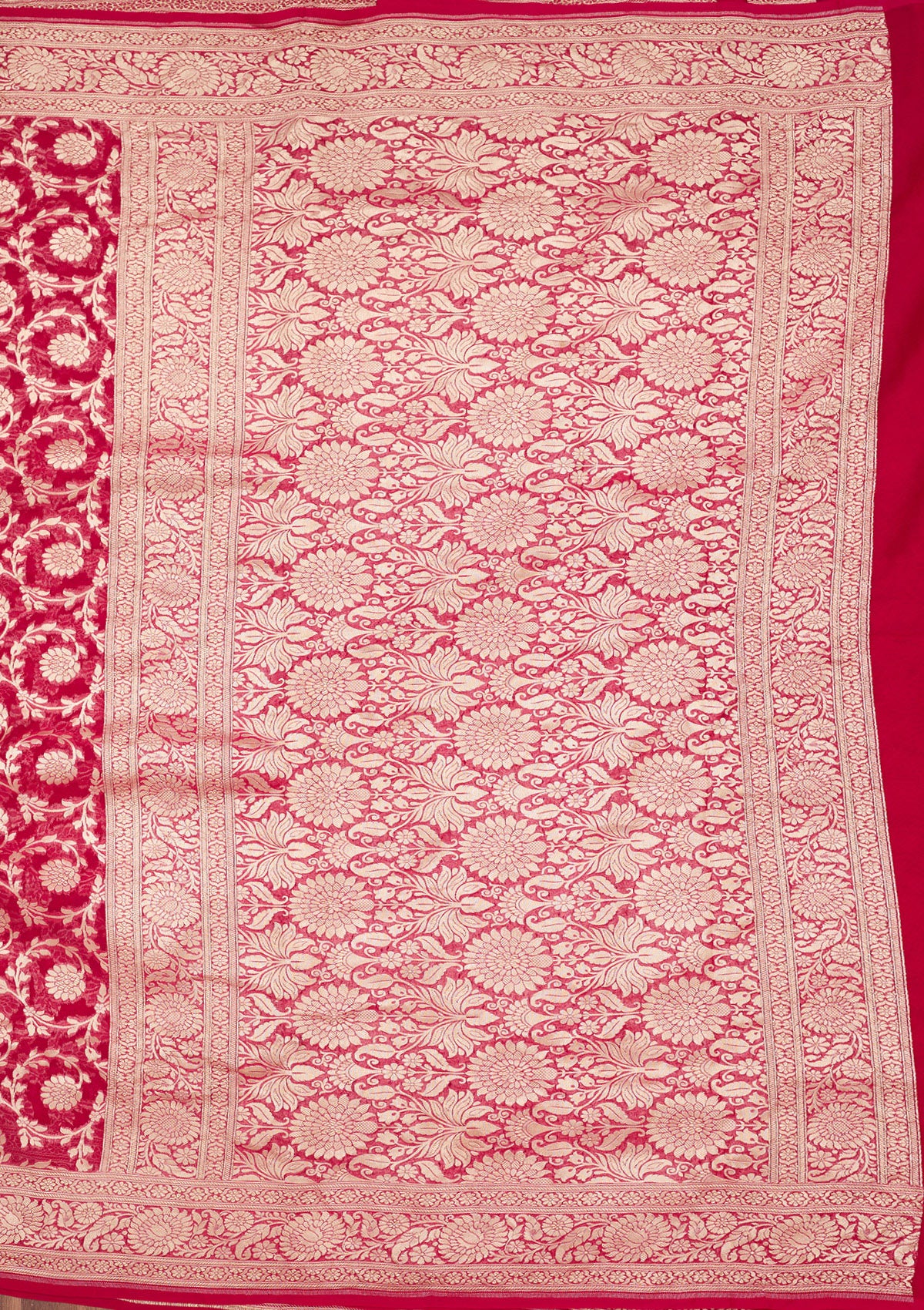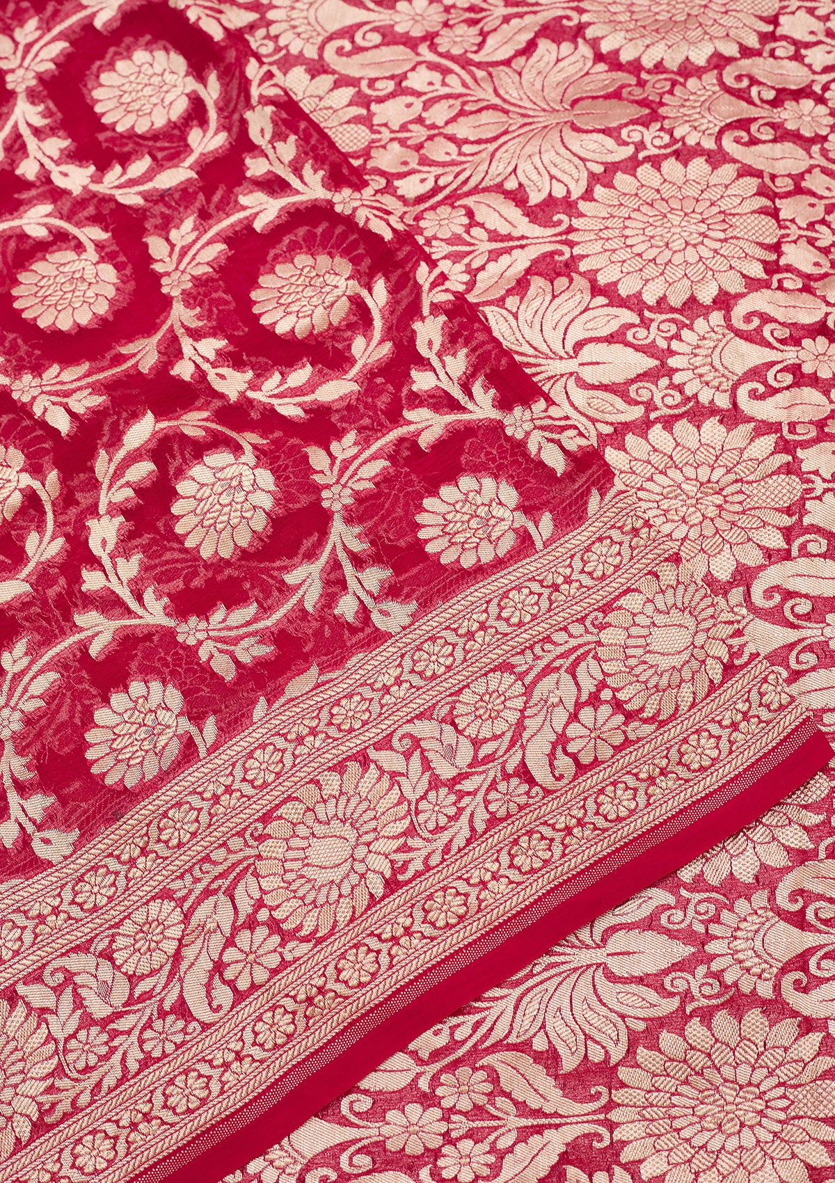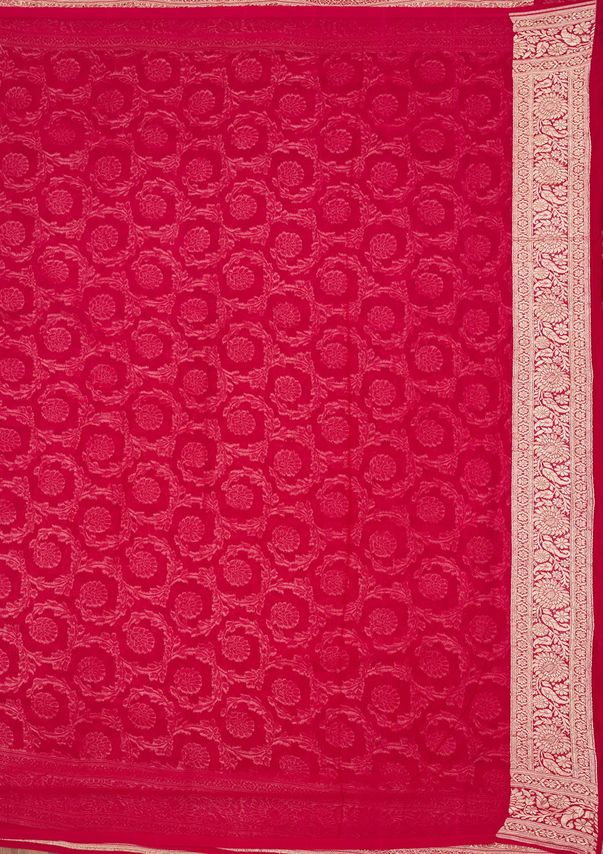 Rani Pink Silk_Saree in Georgette fabric. The Silk_Saree is elevated with Zariwork embroidery. It comes with an Unstitched blouse. Comes with the Koskii promise of premium quality.