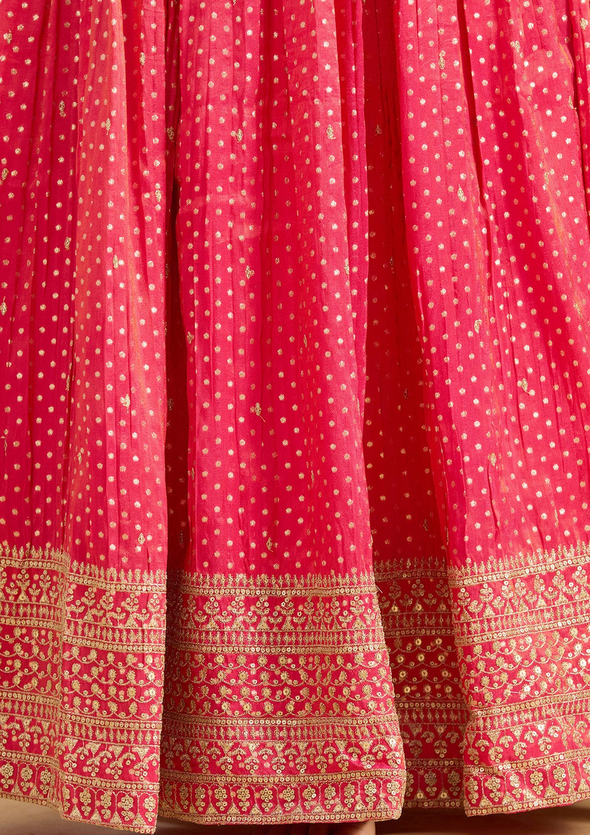 Rani Pink Readymade Lehenga in Brocade fabric. The Lehenga is embellished with Zariwork (Gold) embroidery. Accompanied with an Readymade blouse and dupatta. Comes with the Koskii promise of premium quality.