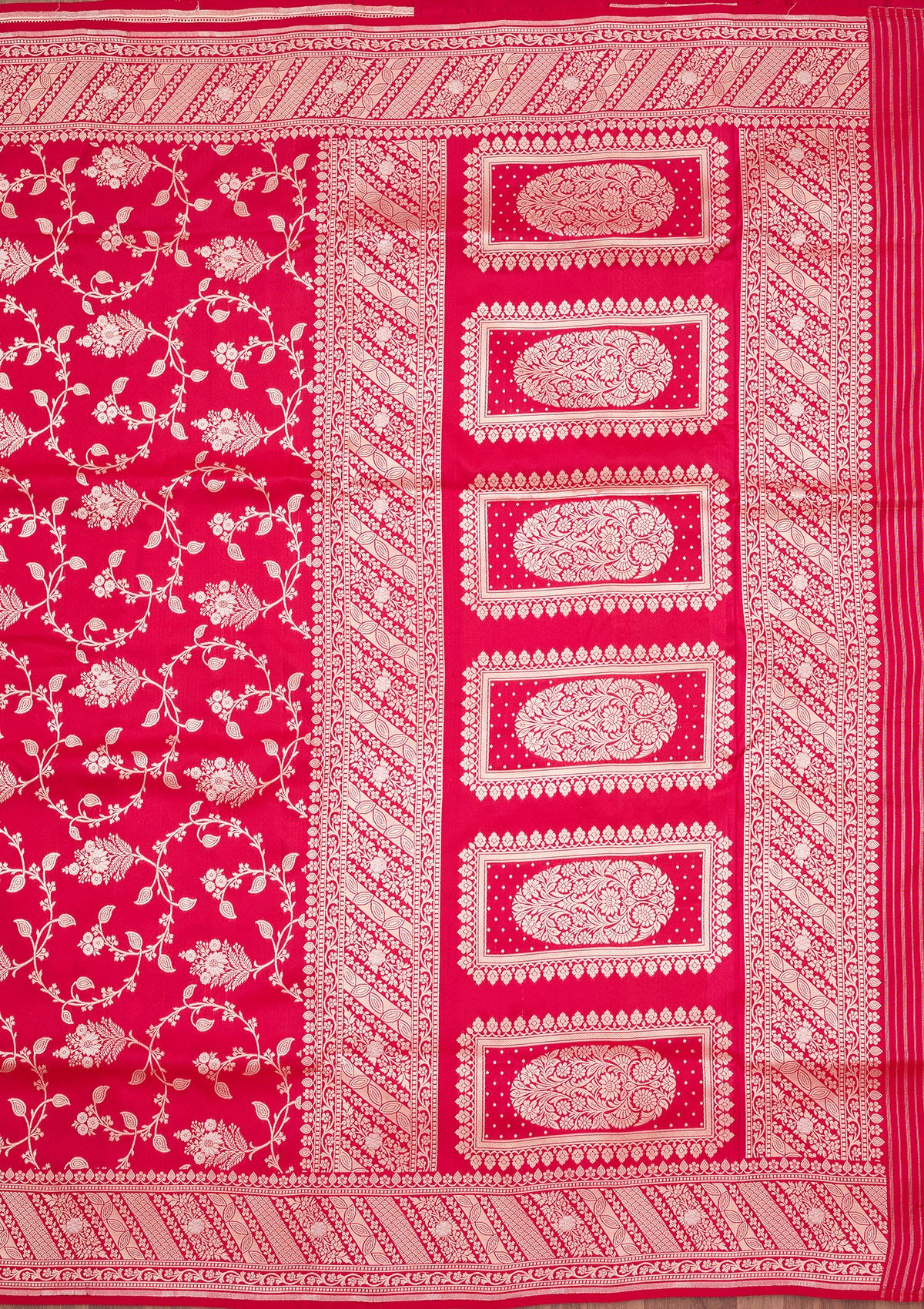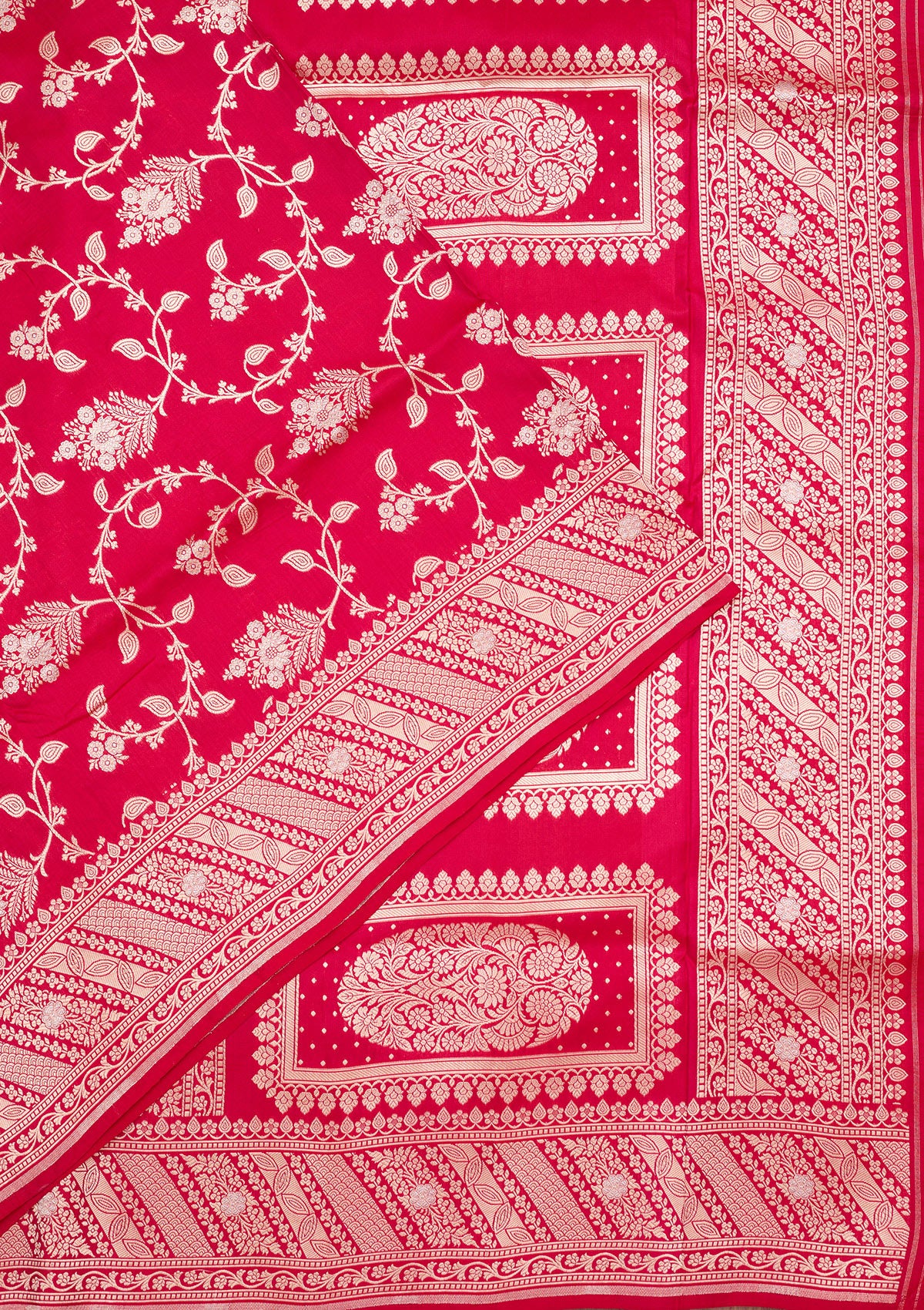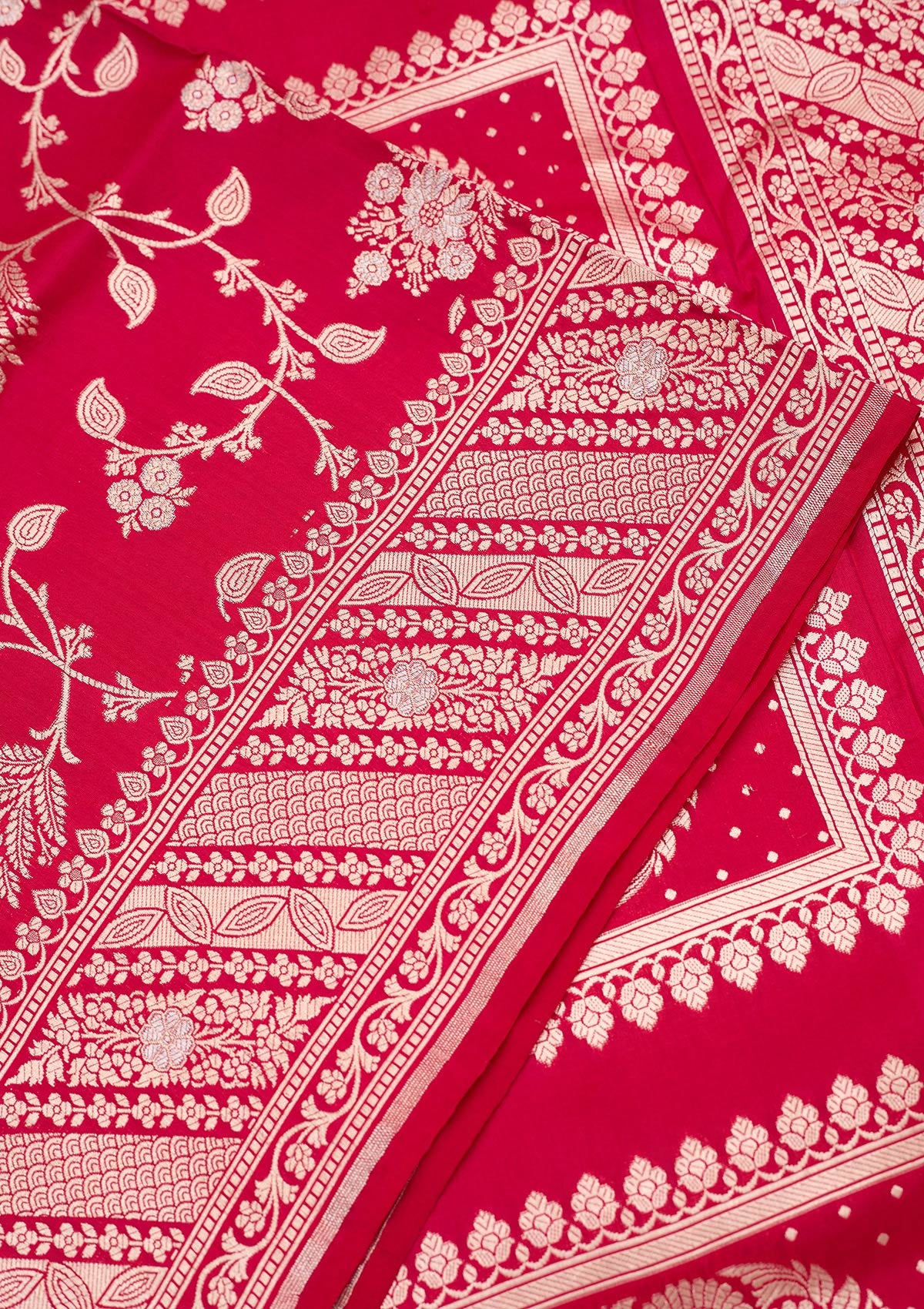 Rani Pink Silk_Saree in Silk fabric. The Silk_Saree is elevated with Zariwork (Gold) embroidery. It comes with an Unstitched blouse. Comes with the Koskii promise of premium quality.
