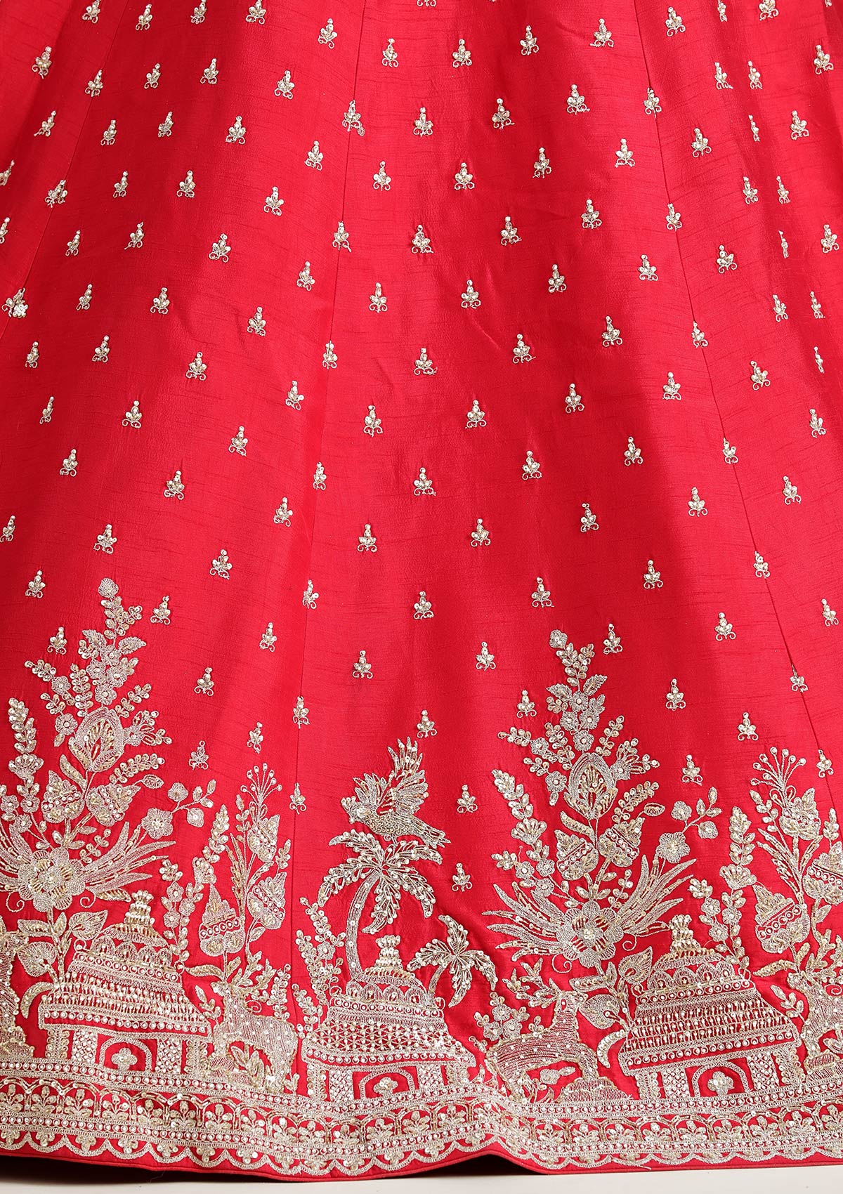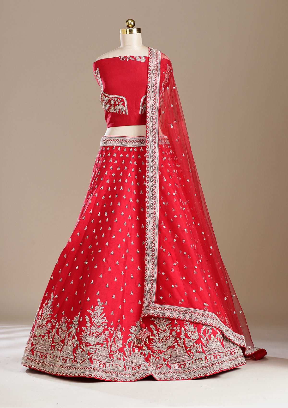 Red Readymade Lehenga in Raw Silk fabric. The Lehenga is embellished with Zardozi (Gold) embroidery. Accompanied with an Readymade blouse and dupatta. Comes with the Koskii promise of premium quality.