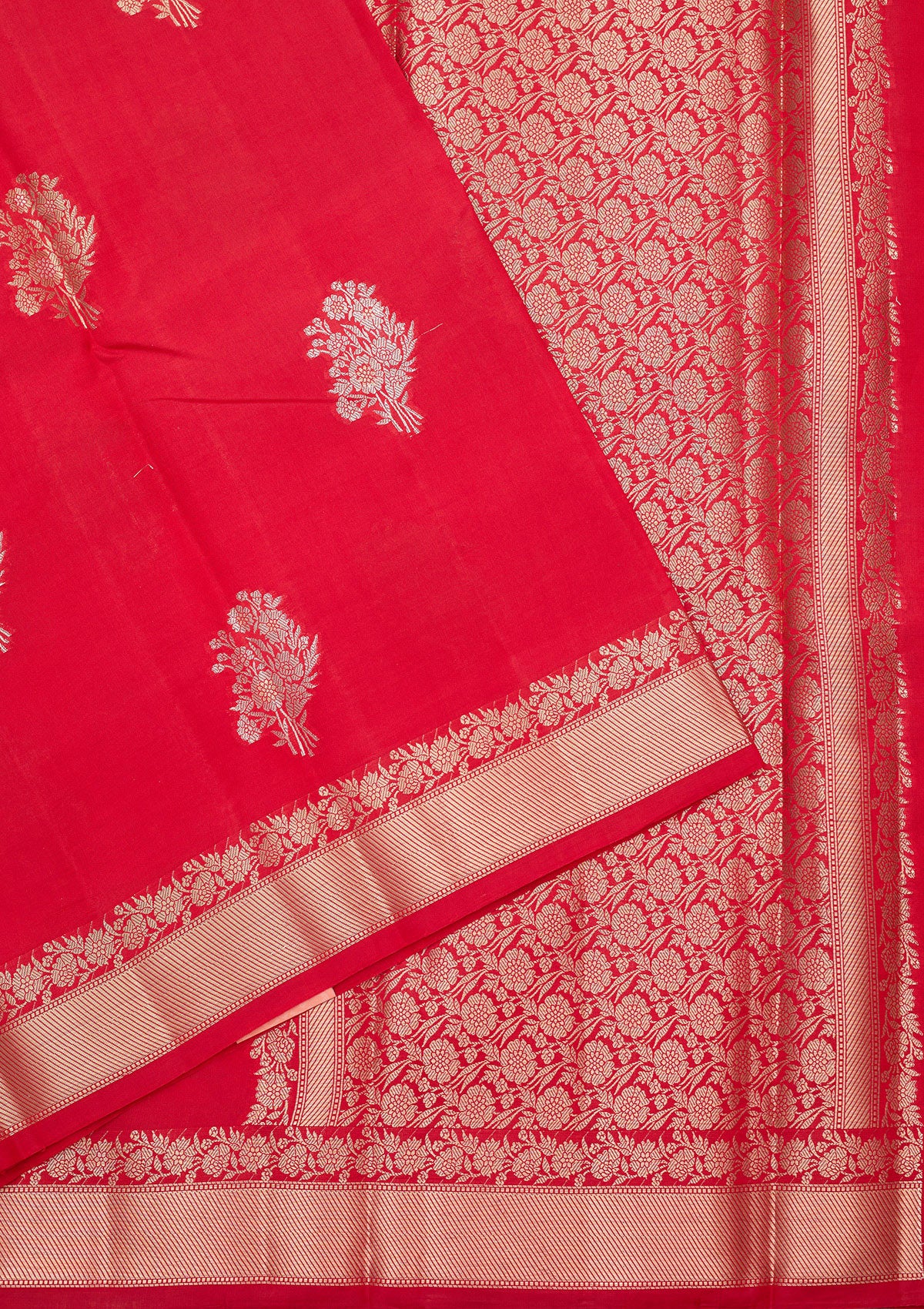 Red Saree in Silk fabric. The Saree is elevated with Zariwork embroidery. It comes with an Unstitched blouse. Comes with the Koskii promise of premium quality.