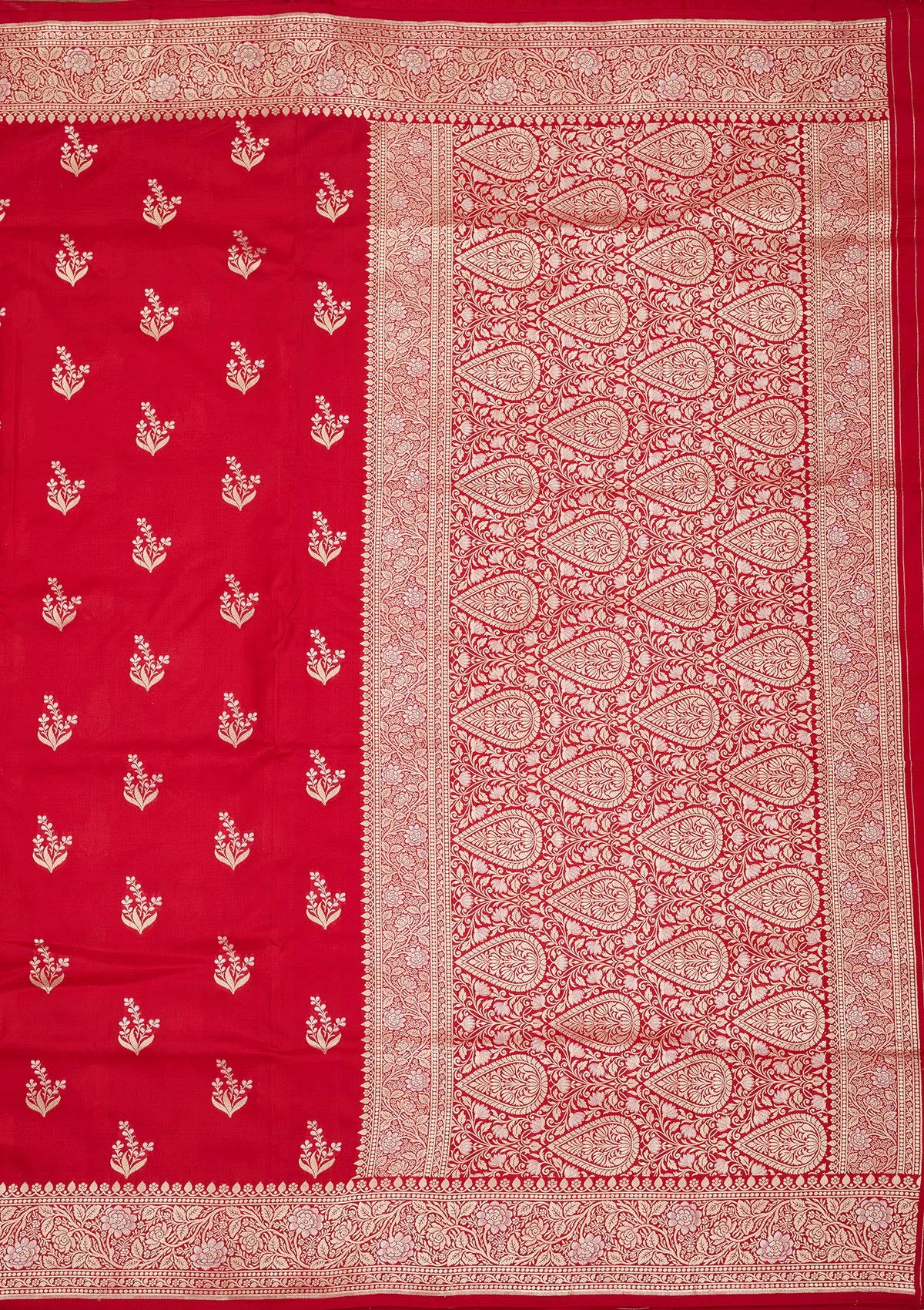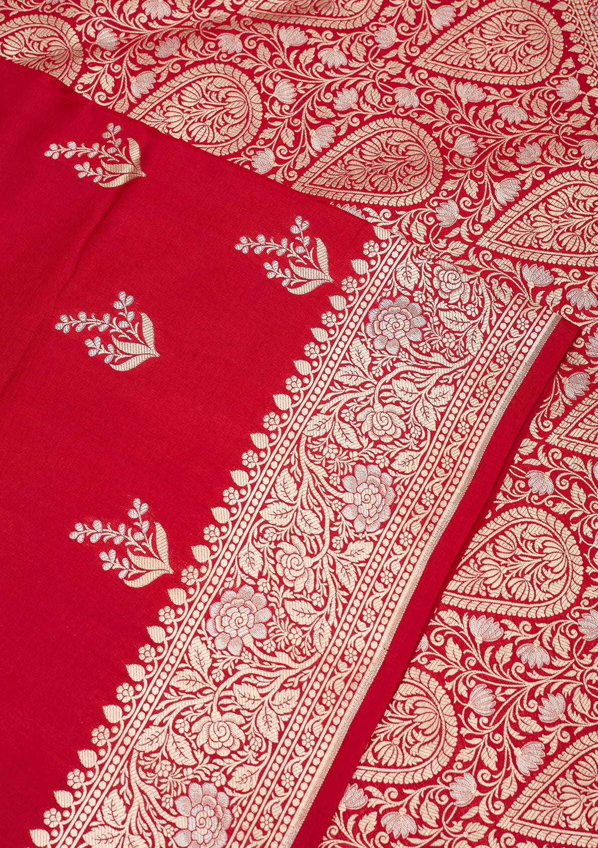 Red Silk_Saree in Pure Silk fabric. The Silk_Saree is elevated with Zariwork embroidery. It comes with an Unstitched blouse. Comes with the Koskii promise of premium quality.