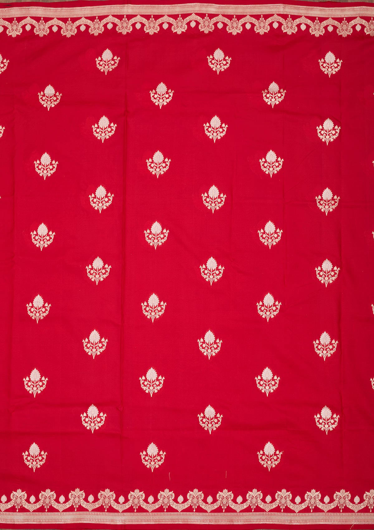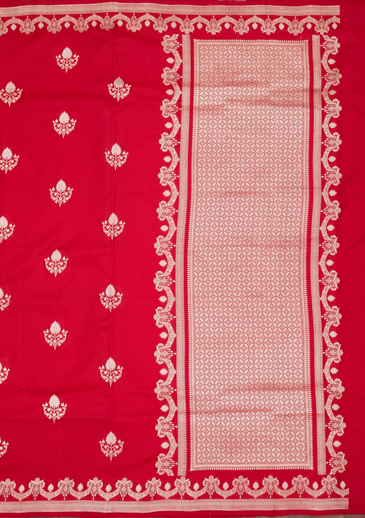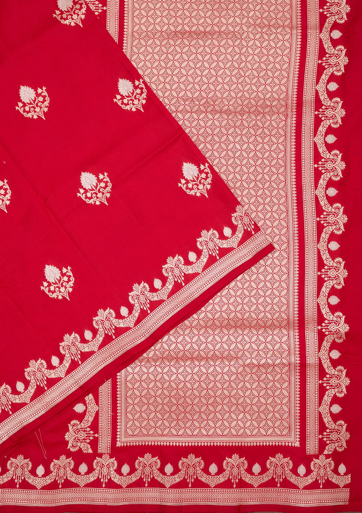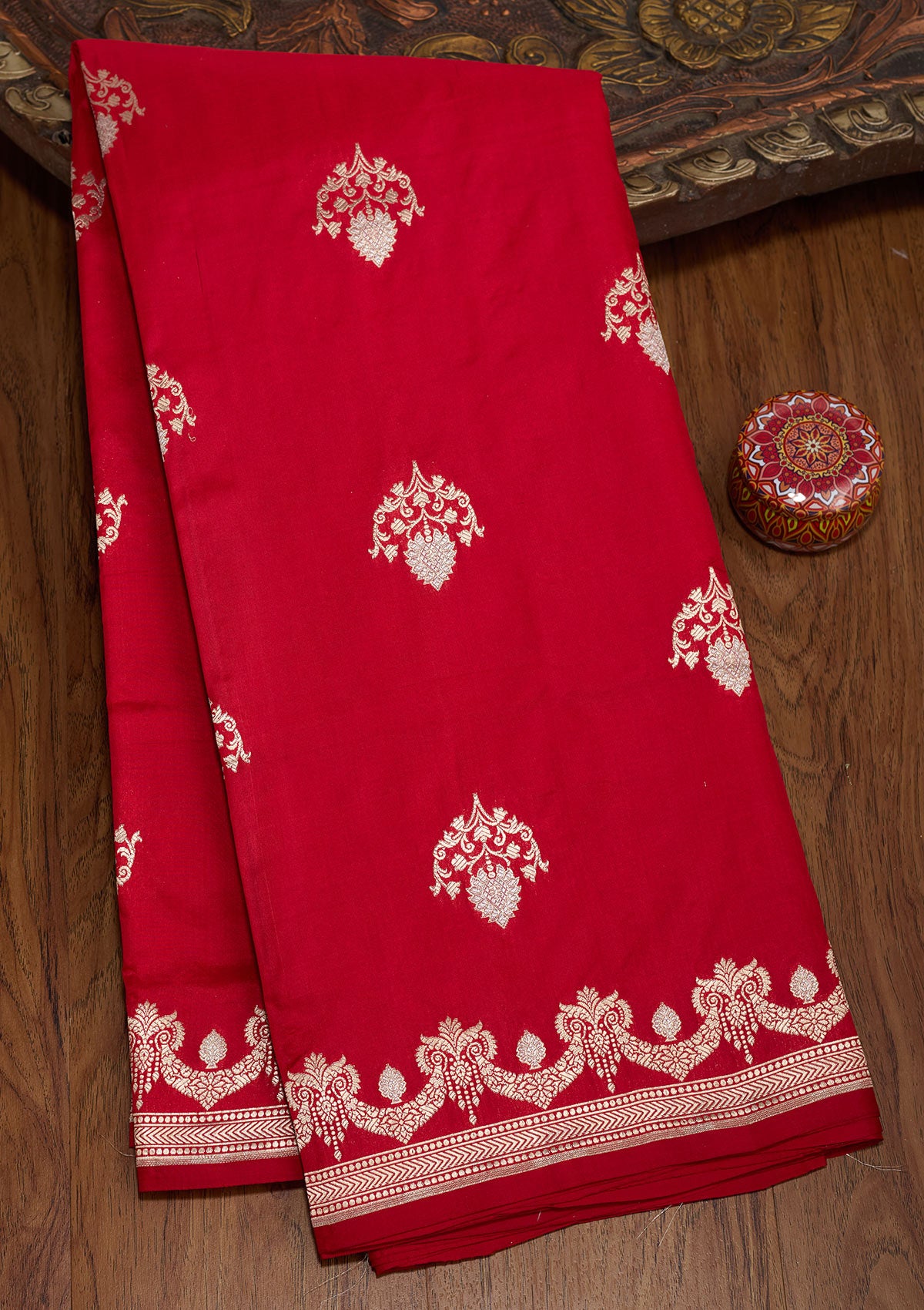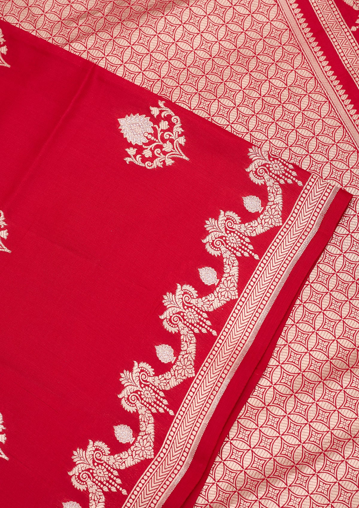 Red Silk_Saree in Pure Silk fabric. The Silk_Saree is elevated with Zariwork embroidery. It comes with an Unstitched blouse. Comes with the Koskii promise of premium quality.
